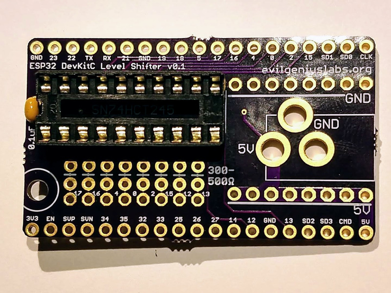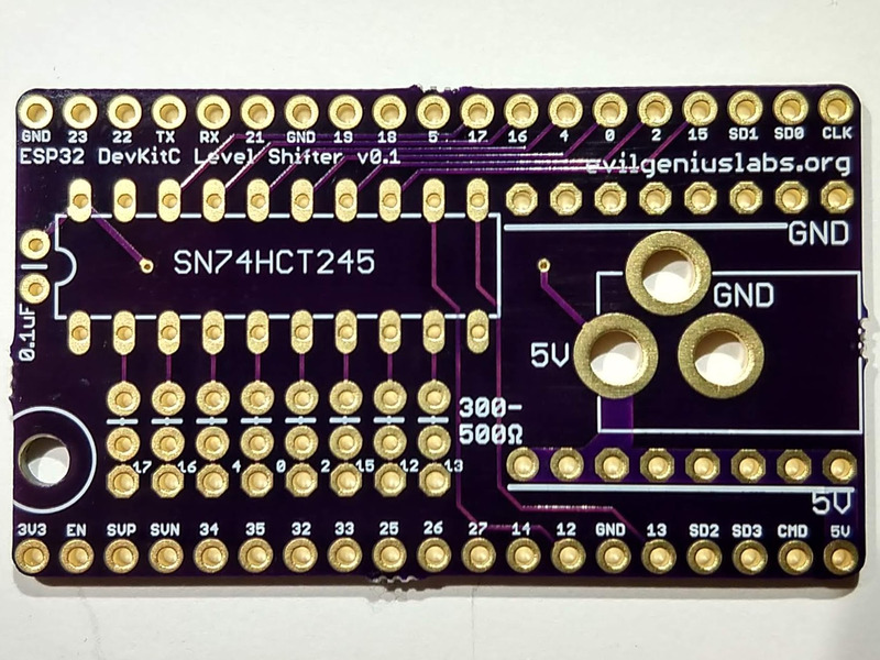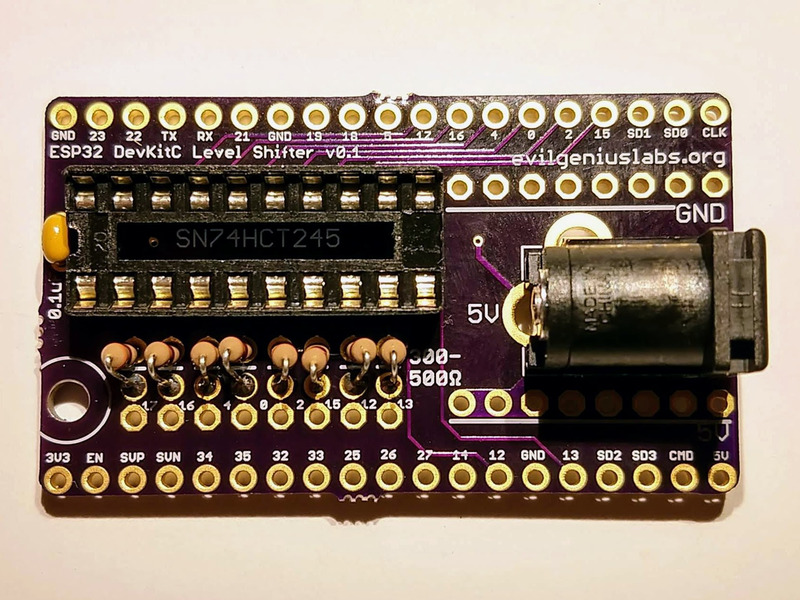 The shield includes a 74HCT245 level shifter, which is the most well-regarded high speed level shifter I’ve found. This shifts the 3.3V logic level of the ESP32 to the 5V expected by addressable RGB LEDs. These projects often work fine without a level shifter, until they don’t.