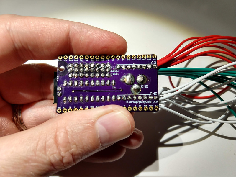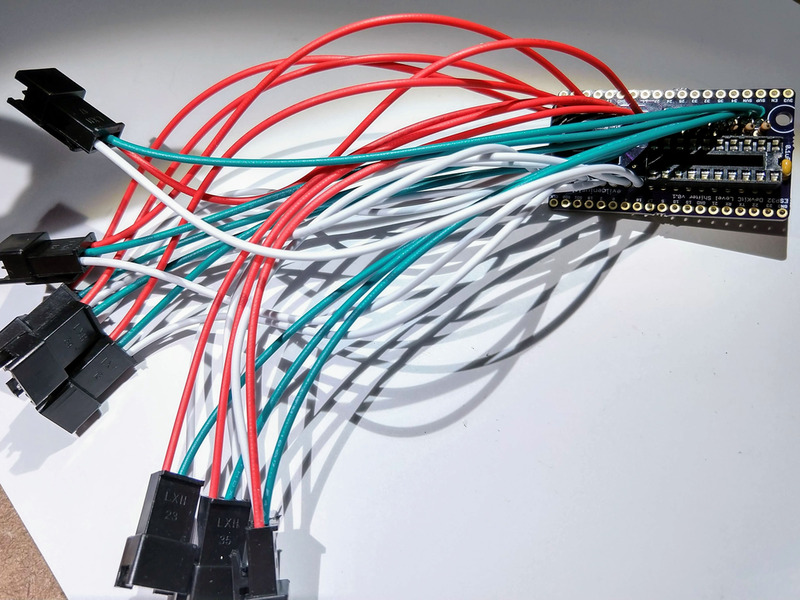 Eight digital output pins (0, 2, 4, 12, 13, 15, 16, 17) are run through the level shifter. It supports parallel output, thanks to Sam Guyer’s excellent work on FastLED ESP32 support.