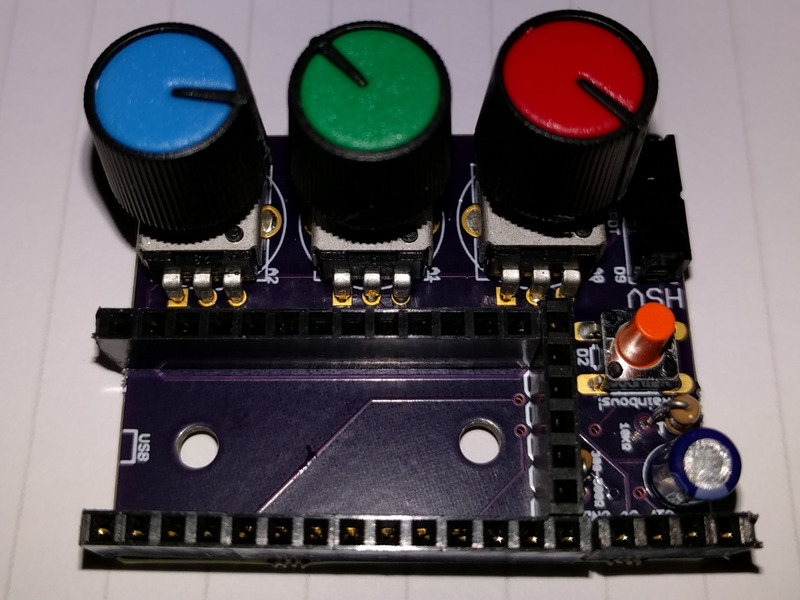 With what I have on hand, I quickly threw together a couple of breadboards, each with a Teensy, some RGB LEDs, and three potentiometers (using Paul Stoffregen’s excellent Sturdy Potentiometer Adapter for Breadboards).