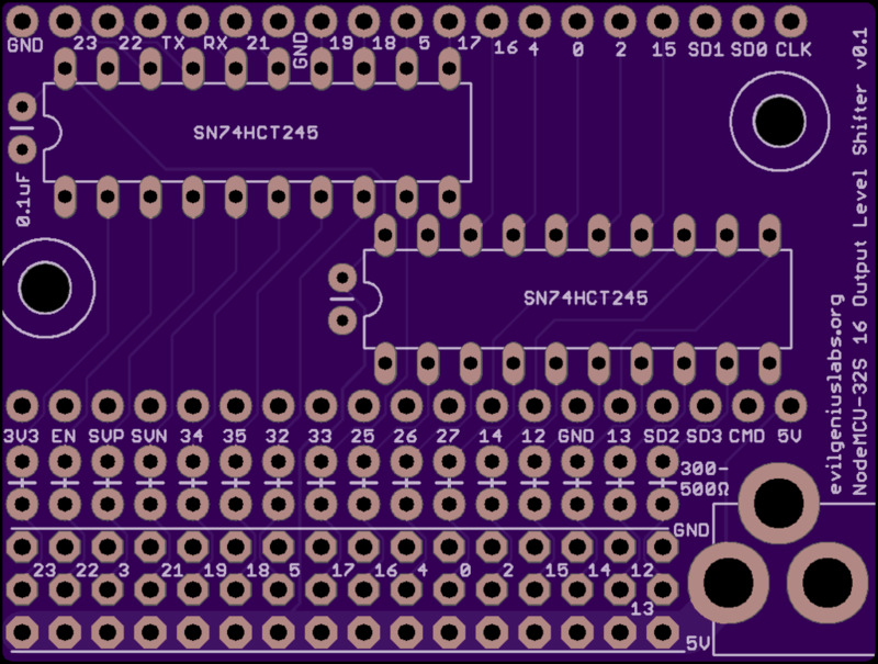 Sixteen digital output pins (0, 2, 3, 4, 5, 12, 13, 14, 15, 16, 17, 18, 19, 21, 22, 23) are run through the level shifter.