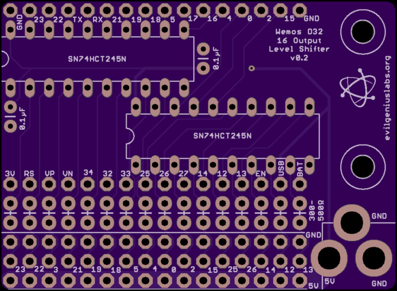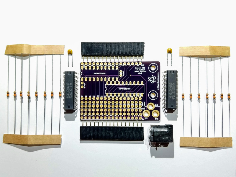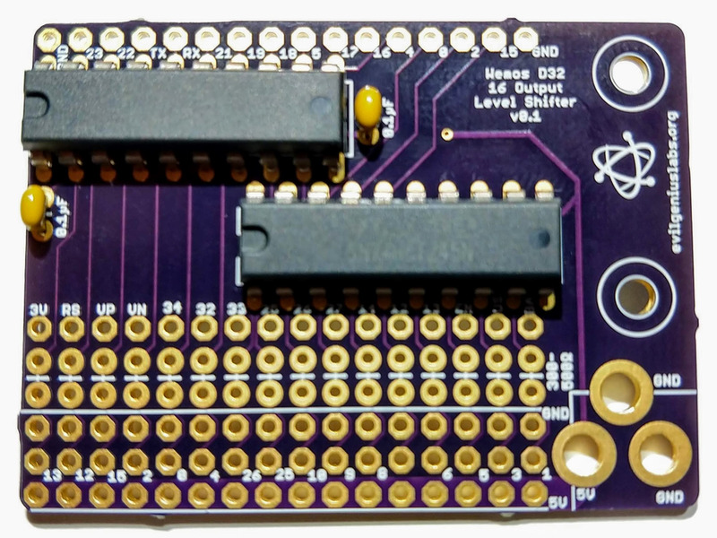 Sixteen digital output pins (0, 2, 3, 4, 5, 12, 13, 14, 15, 16, 17, 18, 19, 21, 22, 23) are run through the level shifter.