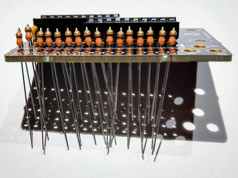 Insert 300 Ohm to 500 Ohm resistors in each set of holes for each output you plan to use. Bend one leg 180 degrees around, flat against the resistor body, and insert it vertically.