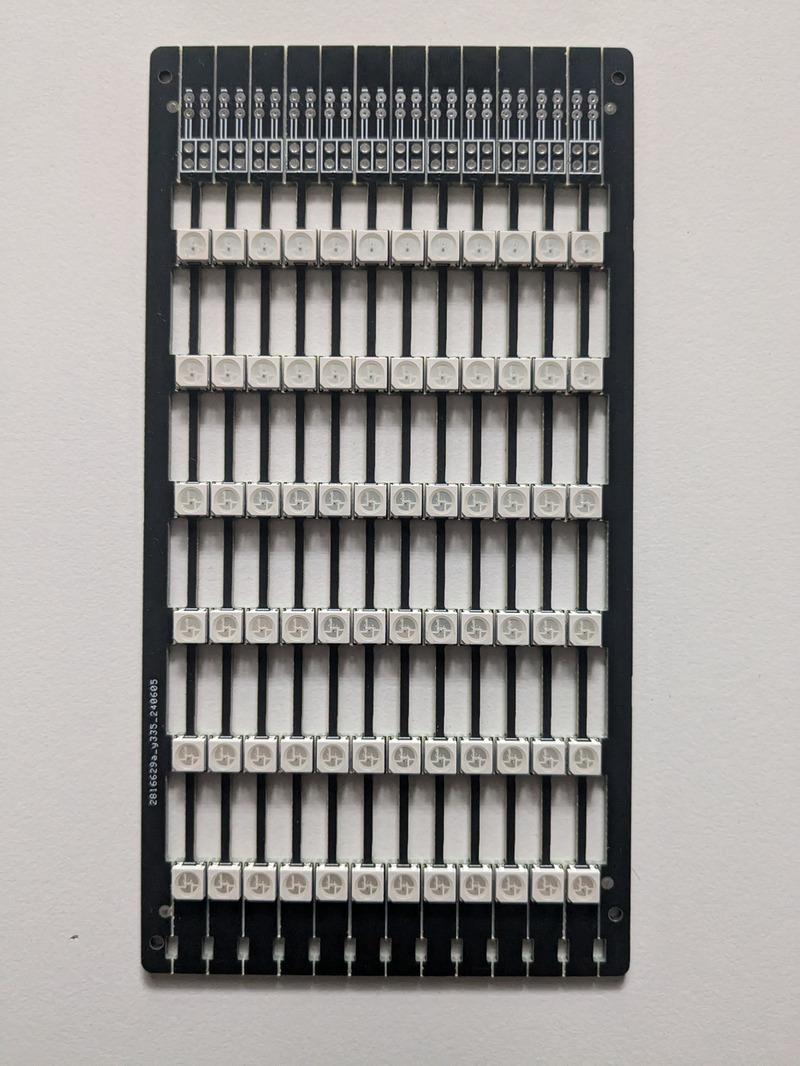 It consists of 216 5mm WS2812 addressable RGB LEDs, divided into 36 vertical sticks, each with 6 LEDs. Each stick has a 2x2 right-angle pin header (5V, GND, Data In, and Data Out). The data is routed from the Data In pin to the first (bottom) LED, which has its Data Out pin connected to the Data In pin of the next LED, etc. The last (top) LED on the stick then has its Data Out pin routed back down the stick to the Data Out pin on the header.