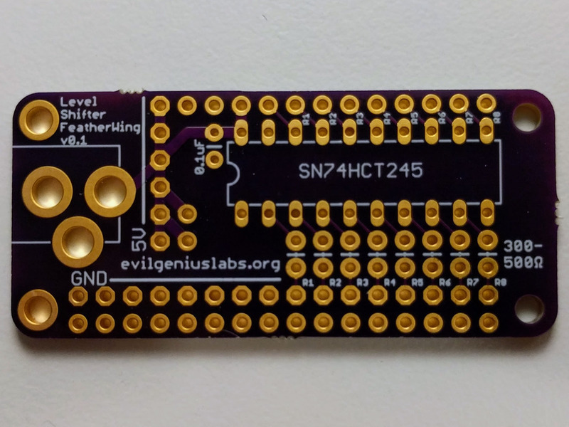 The shield includes a 74HCT245 level shifter, which is the most well-regarded high speed level shifter I’ve found. This shifts the 3.3V logic level of the ESP32 to the 5V expected by addressable RGB LEDs. These projects often work fine without a level shifter, until they don’t.