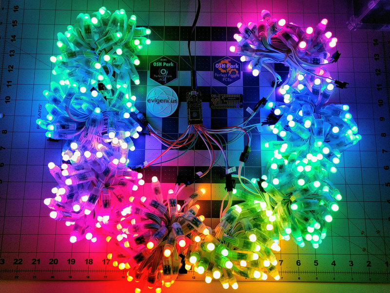 The shield also includes places for data line resistors as recommended when driving LEDs. A large capacitor should be connected across the power and ground connections near the LEDs. A barrel connector can be added to connect a power supply, but the connector and PCB are only rated for 2.5A. That’s enough for about 50 LEDs at solid white, full brightness. For larger quantities, power should be connected directly to the LEDs, and/or brightness should be limited in software.