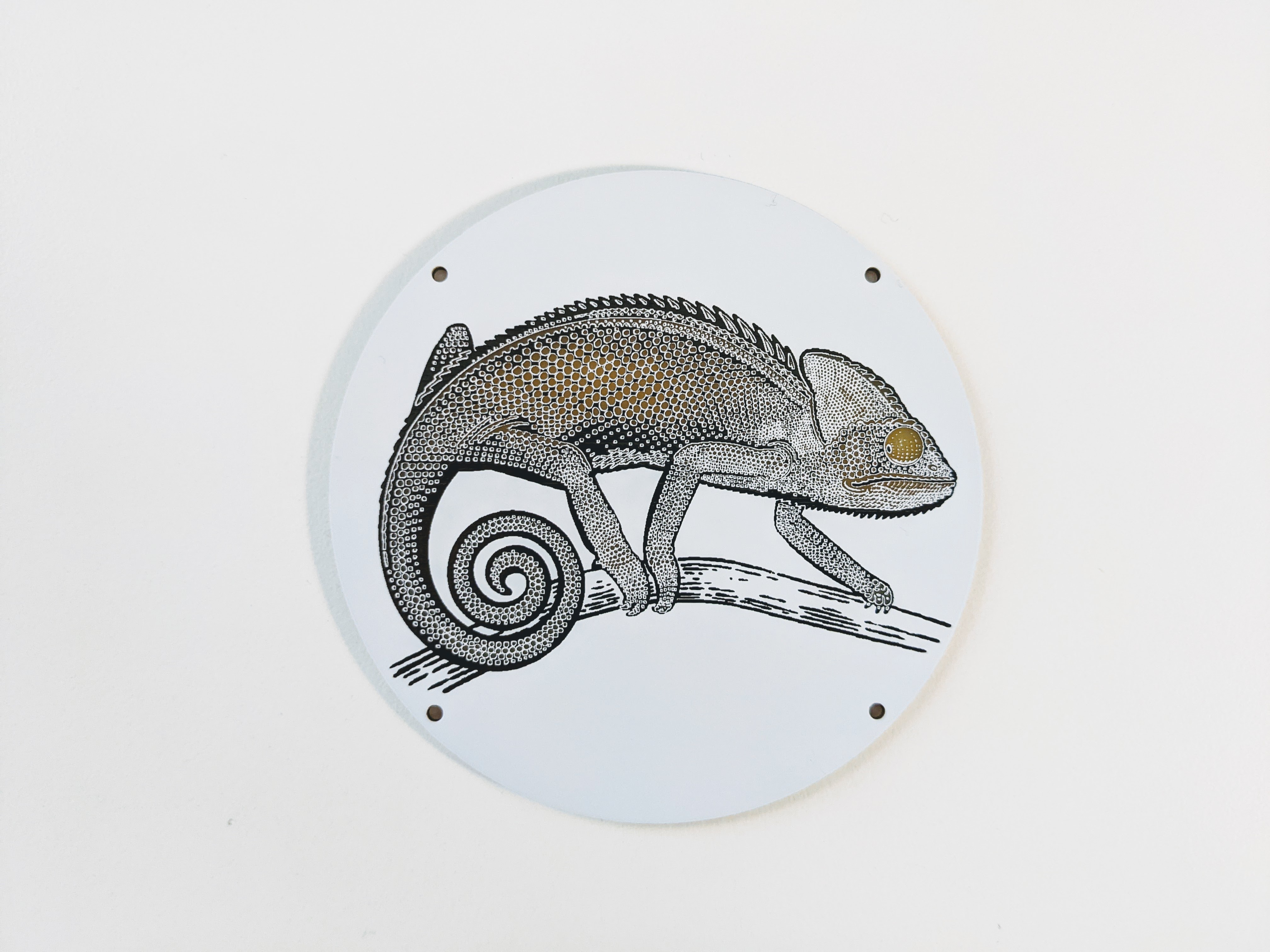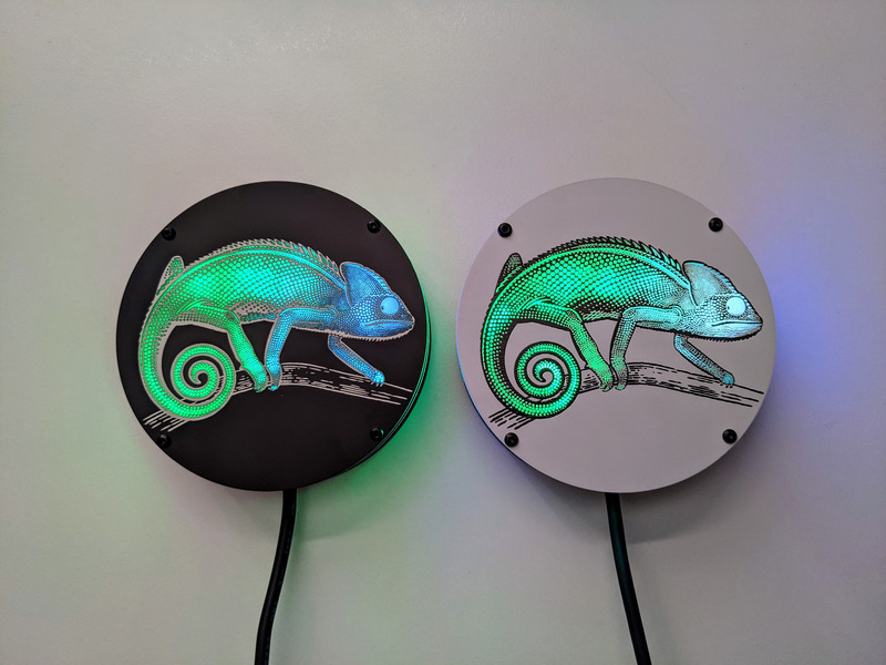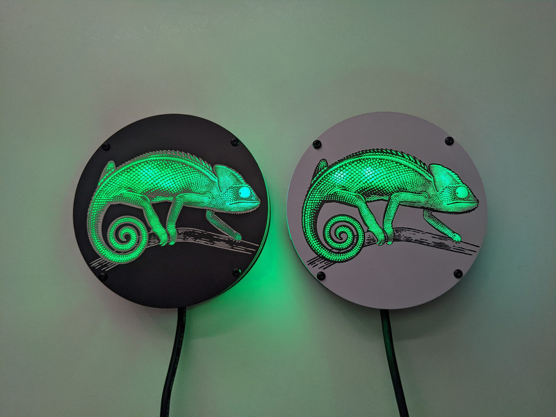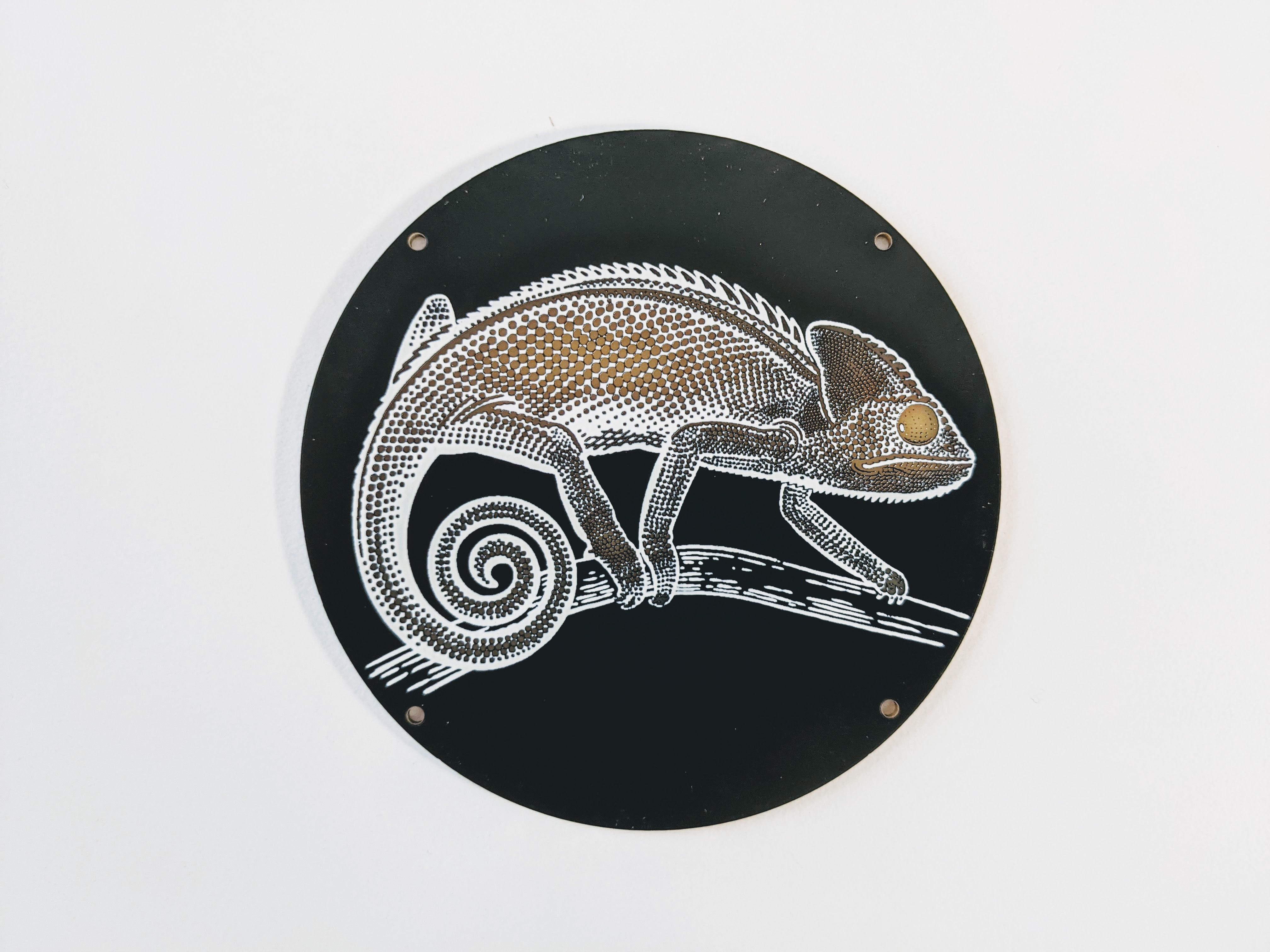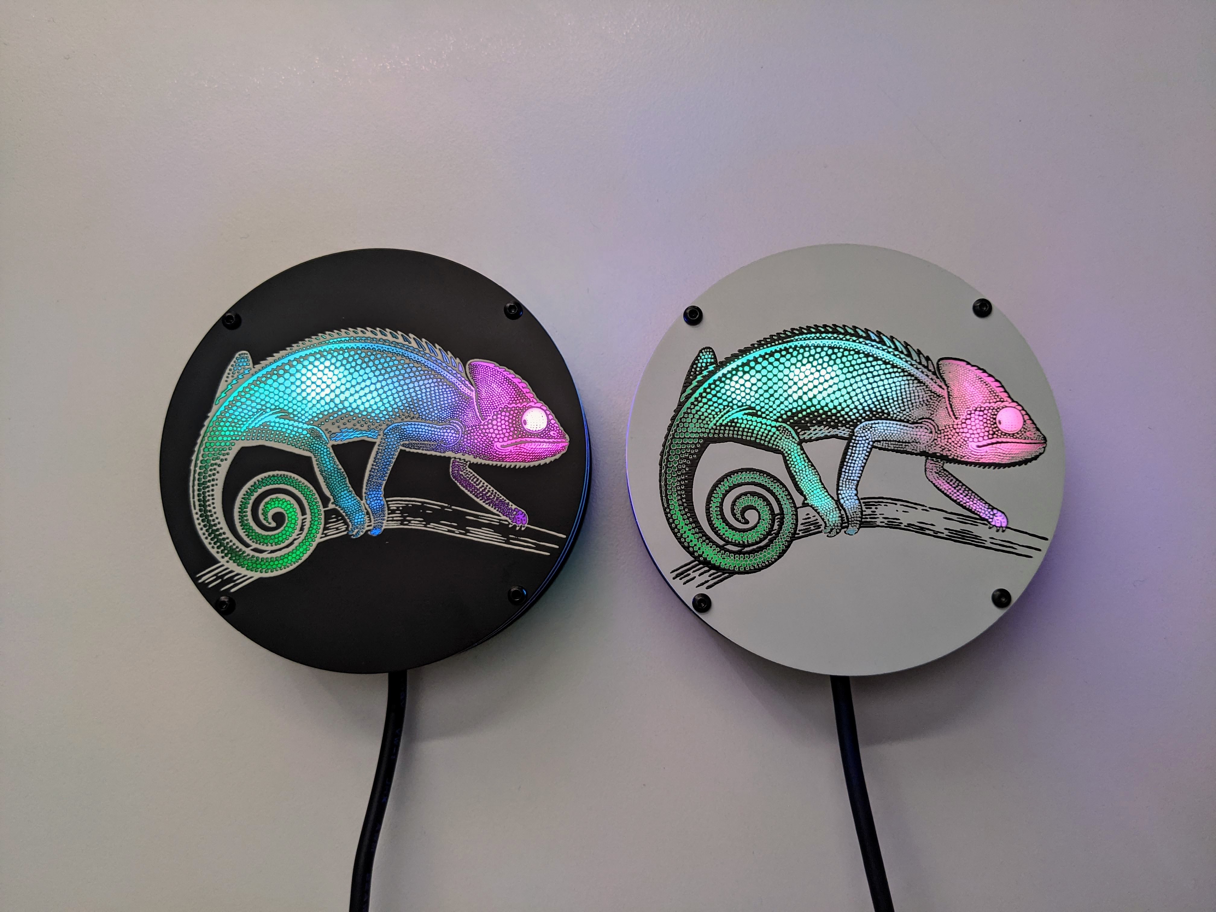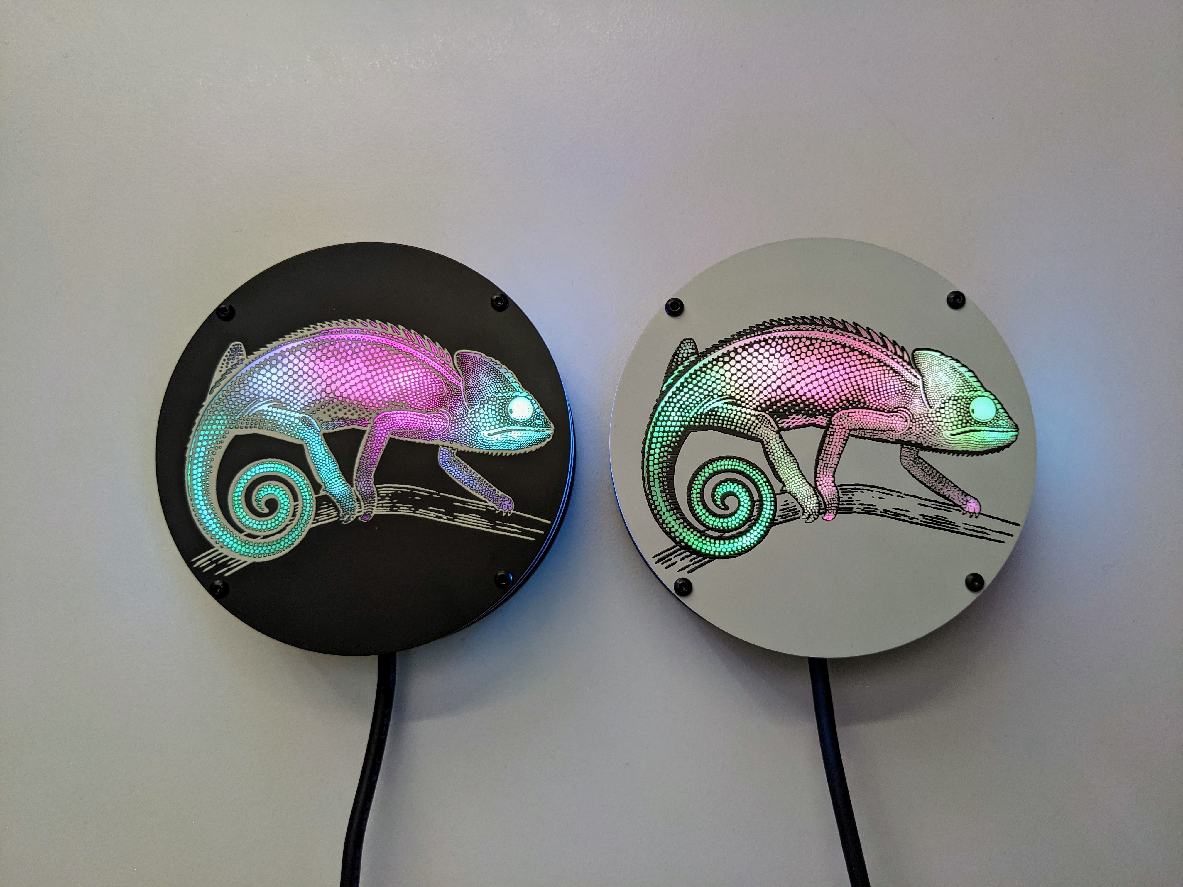 The top PCB has the Chamealeon design in exposed FR4 (fiberglass) on both sides that allows the light from the LEDs on the middle PCB to shine through. White silkscreen on matte black (or black silkscreen on white) soldermask provides all of the details of the design on both sides. Holes for M2 bolts/screws are included on all three PCBs.