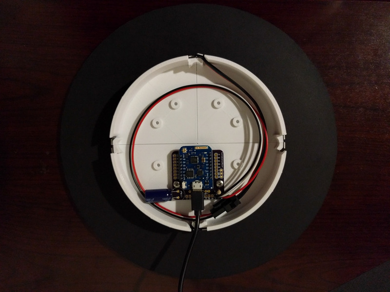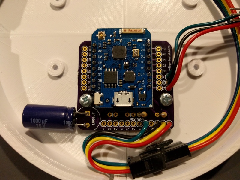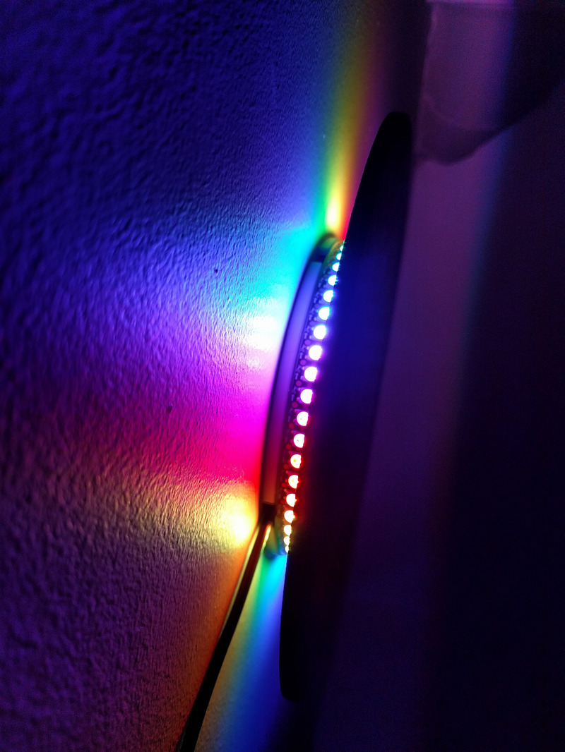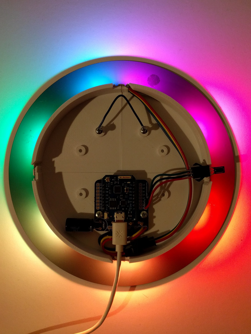 Small (5.25” / 133.35mm) clock and art display built with 60 RGB LEDs, controlled with an ESP8266 using the FastLED library.