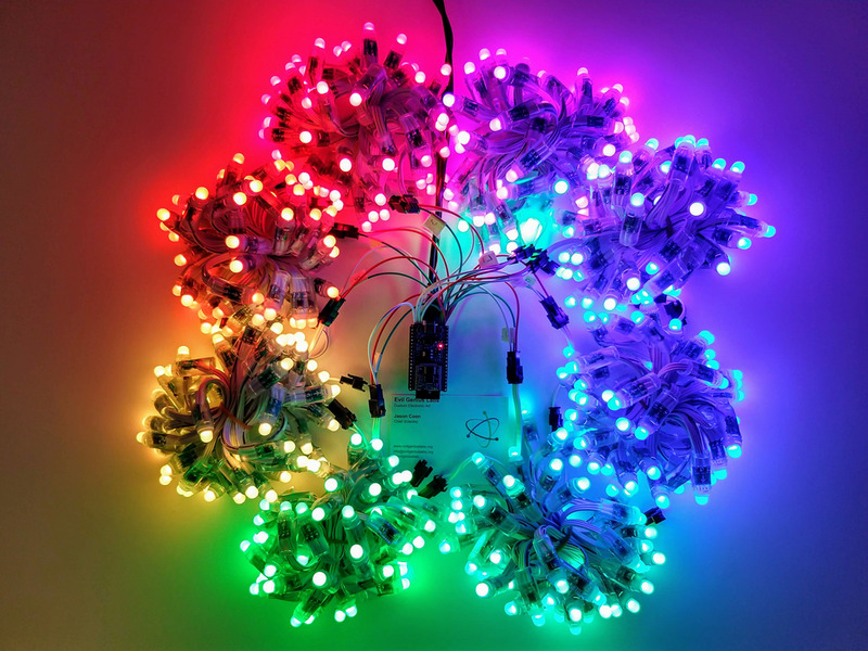 The shield also includes places for data line resistors as recommended when driving LEDs. A large capacitor should be connected across the power and ground connections near the LEDs. A barrel connector can be added to connect a power supply, but the connector and PCB are only rated for 2.5A. That’s enough for about 50 LEDs at solid white, full brightness. For larger quantities, power should be connected directly to the LEDs, and/or brightness should be limited in software.