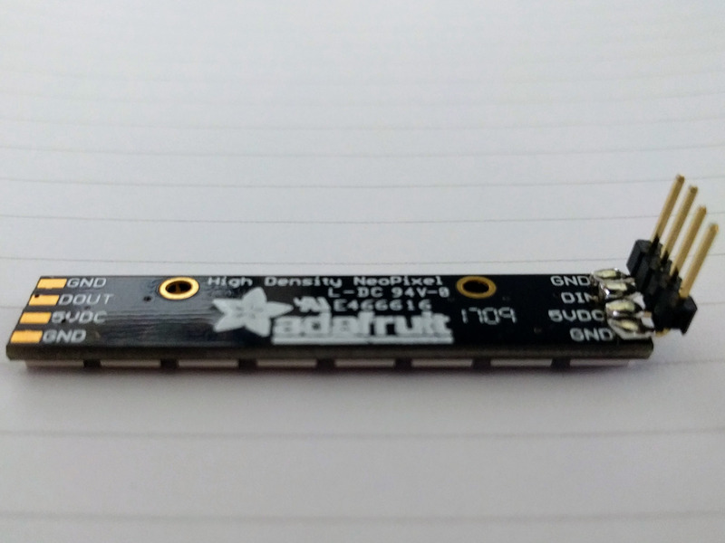 Use a third hand, clothes pin, paper clip, etc to hold the short side of the right-angle header pins on the “DIN” side of the NeoPixel strip while you solder. The longer legs of the pins, with the black plastic insulator, should be sticking up at a right angle from the NeoPixel stick.