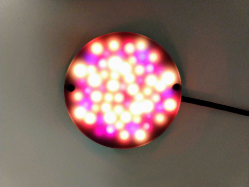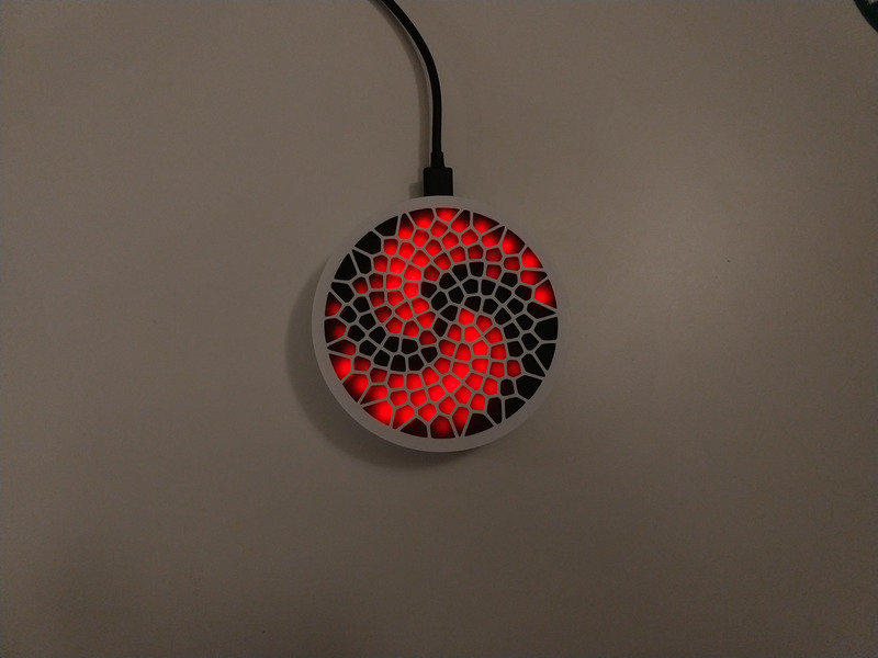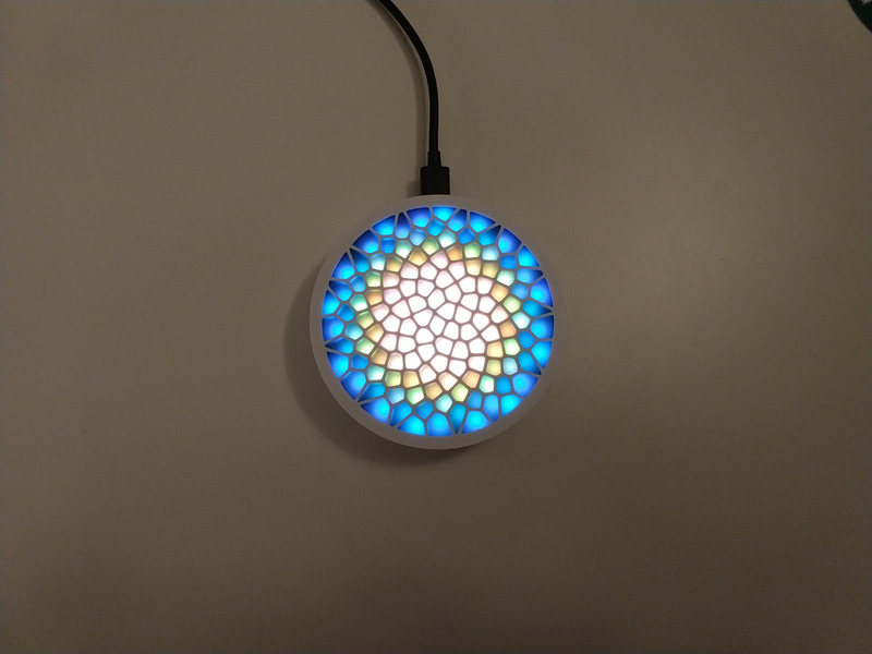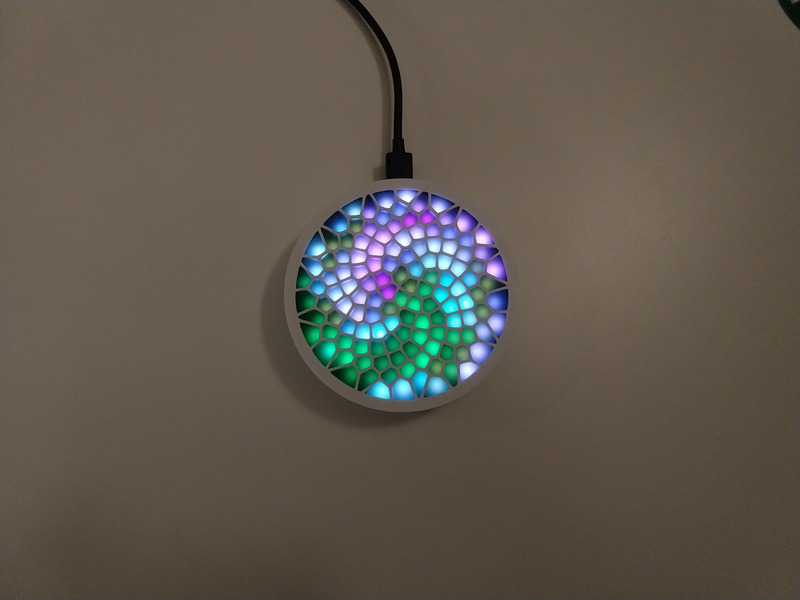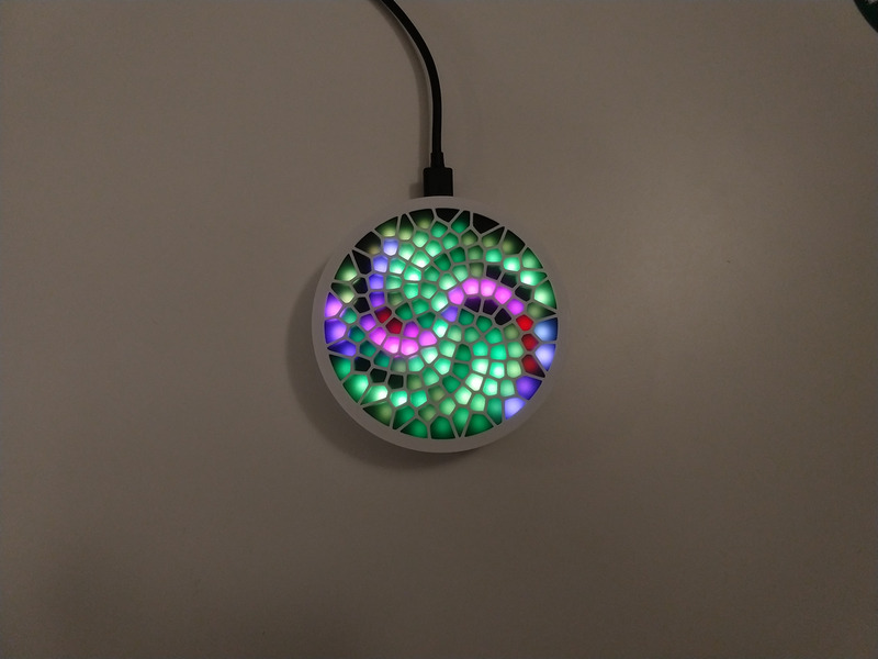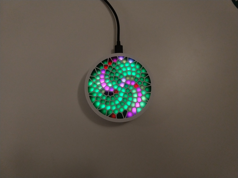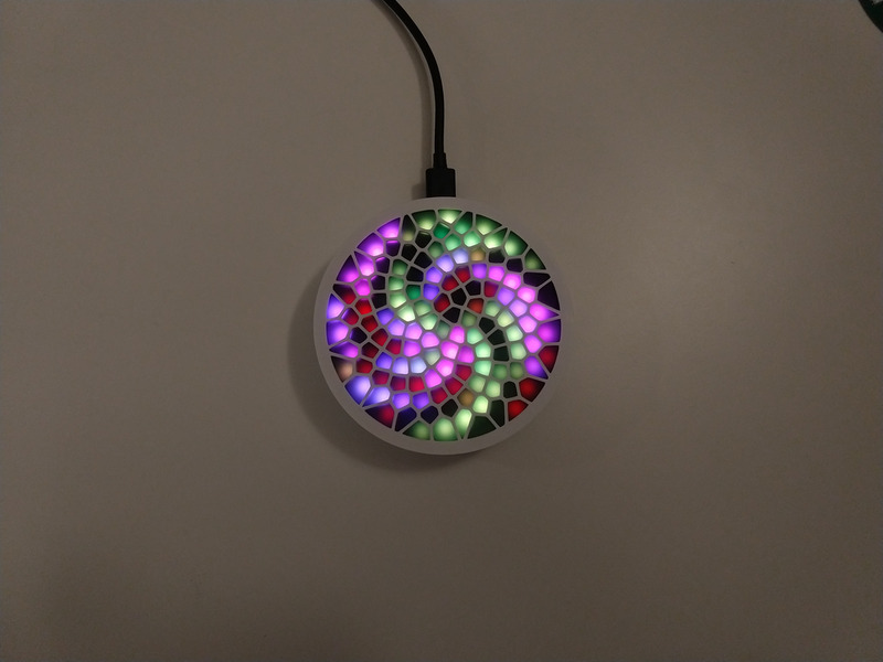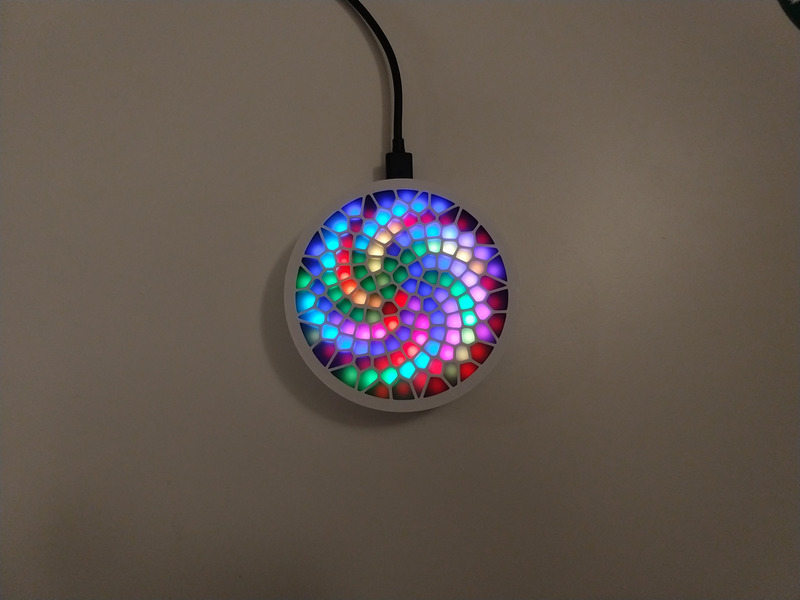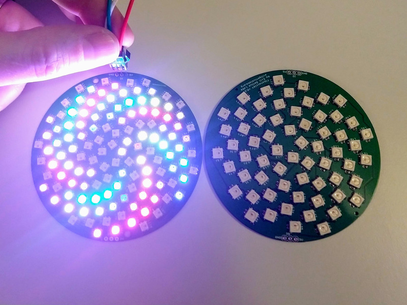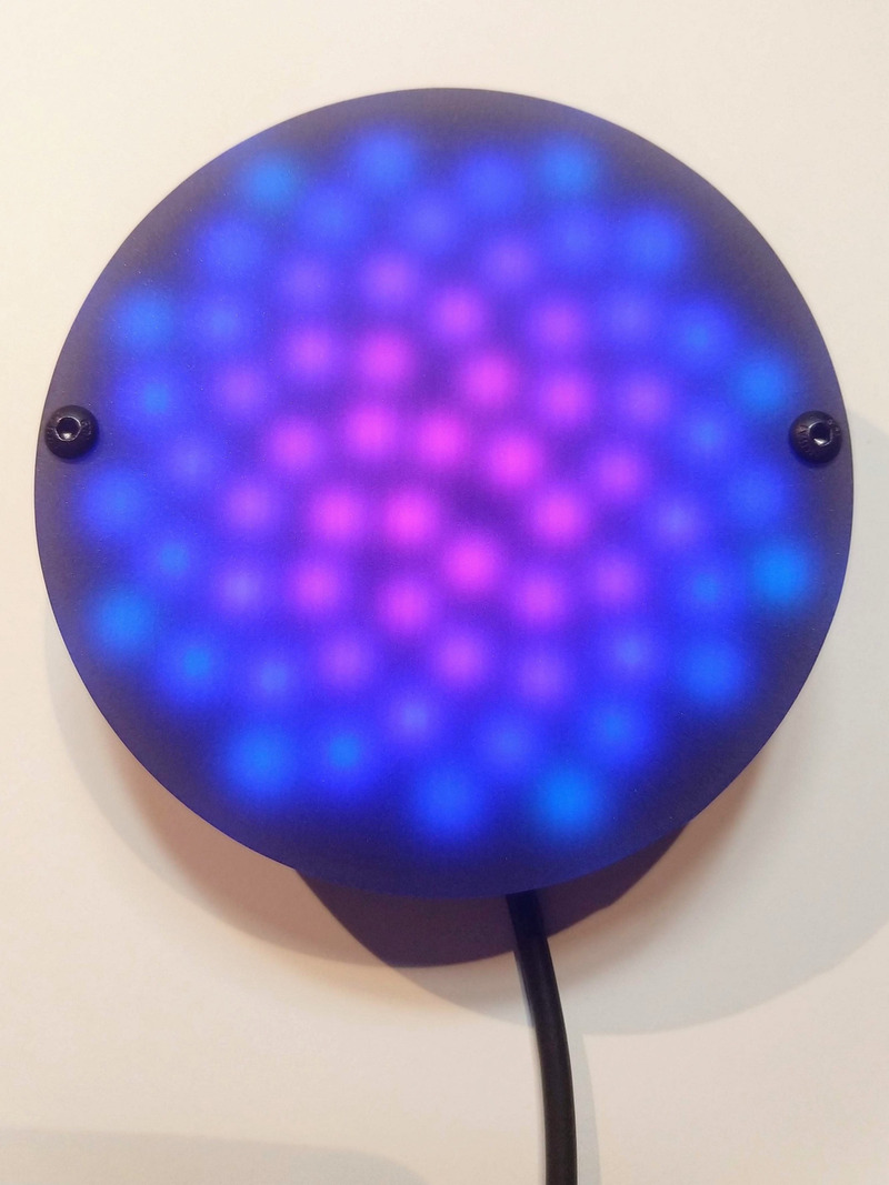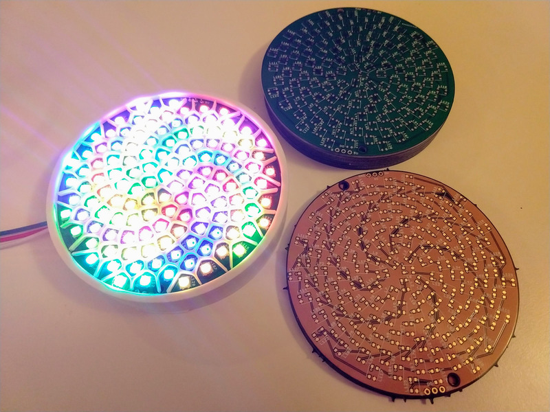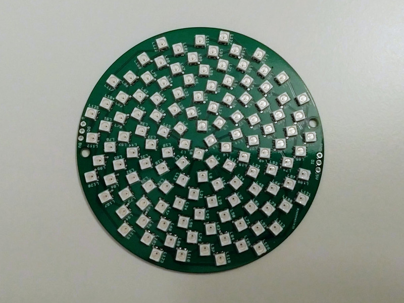 It consists of 128 RGB LEDs, arranged into a circular Fermat’s spiral pattern.