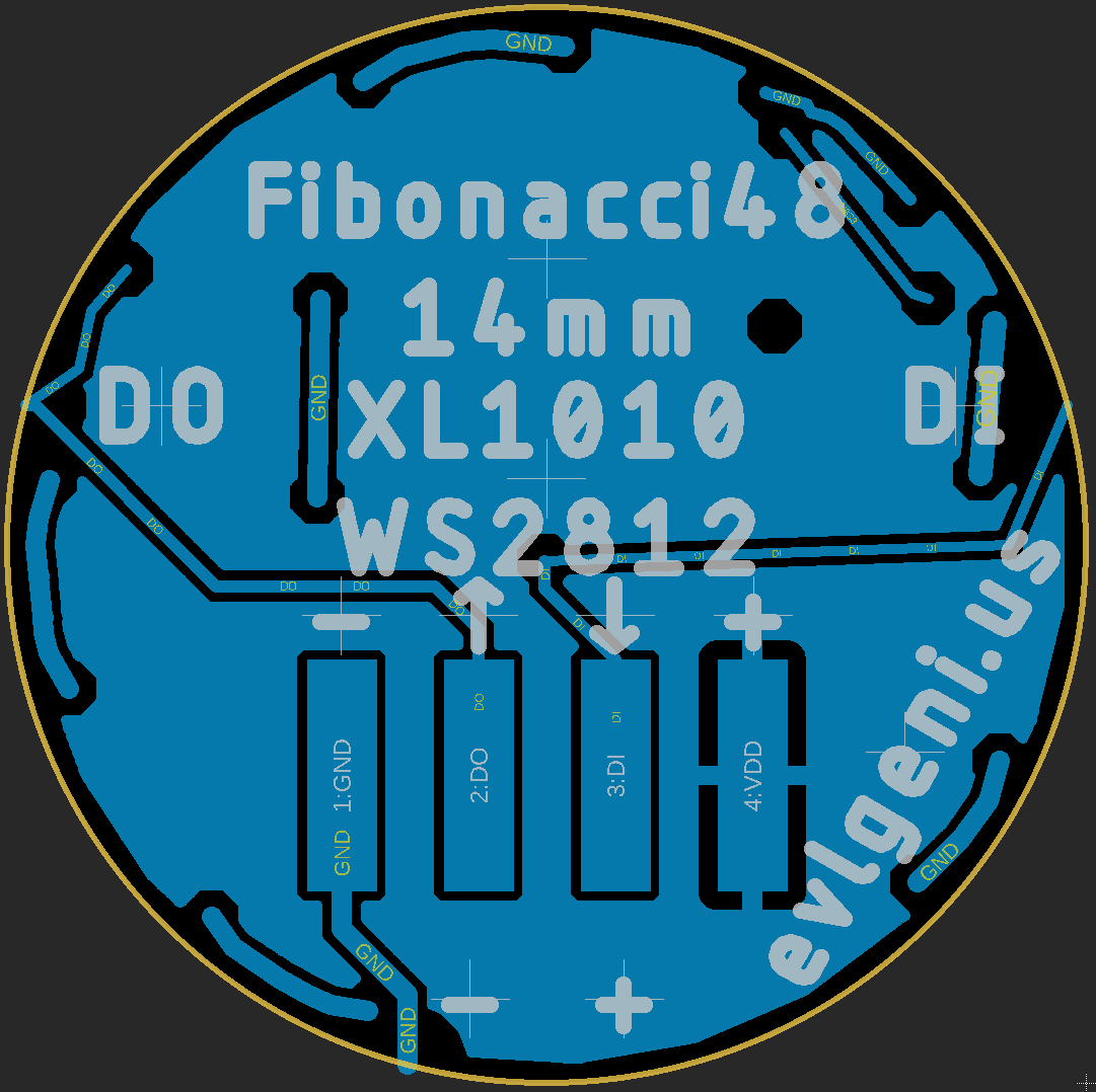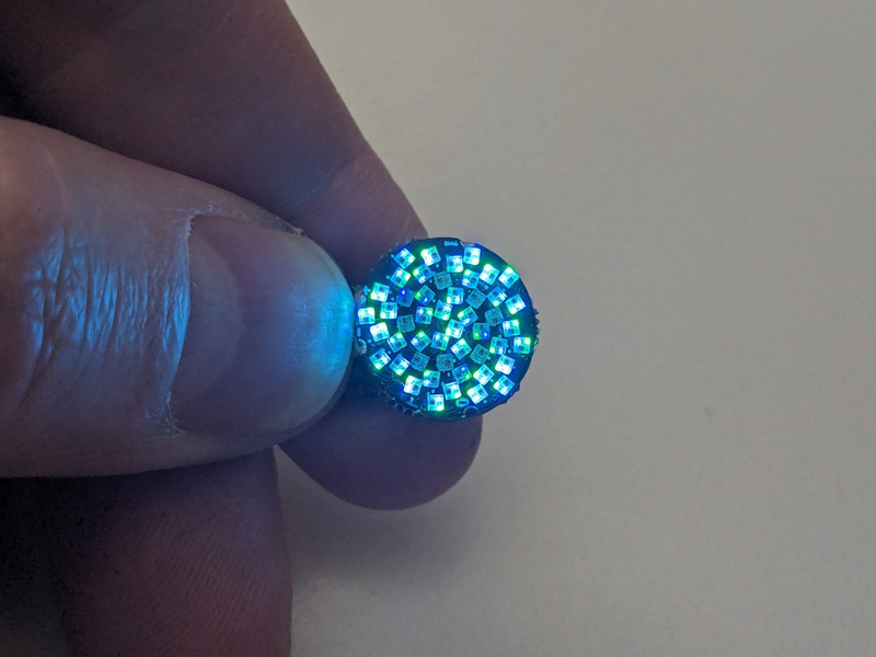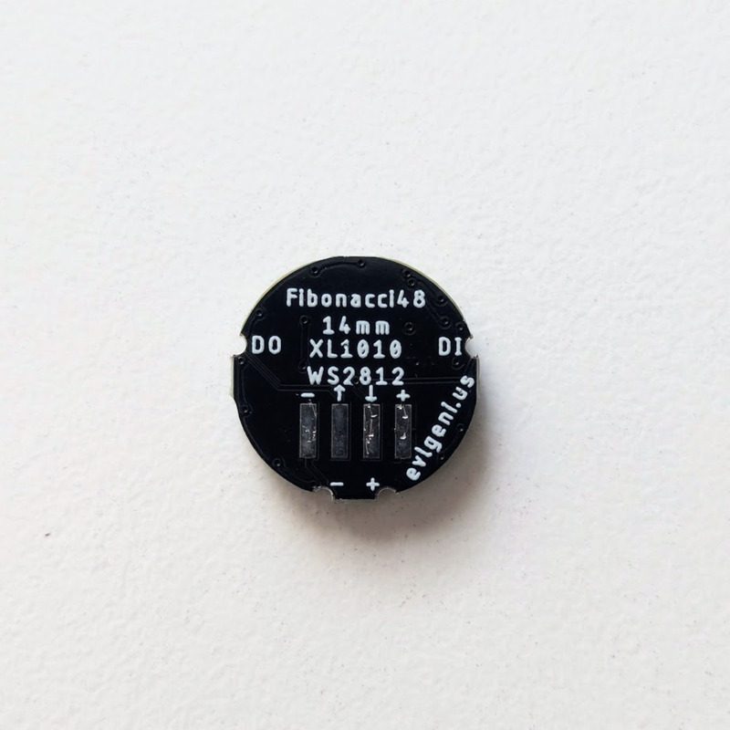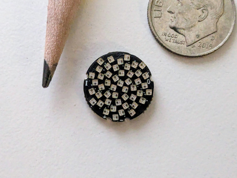 It consists of 48 XL-1010RGBC-WS2812B 1mm² RGB LEDs, arranged into a circular Fermat’s spiral pattern.