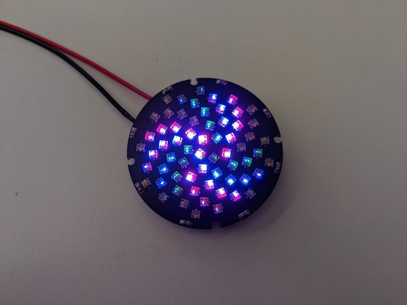 It consists of 64 SK9822-EC2020 HDR (High Dymanic Range) RGB LEDs, arranged into a circular Fermat’s spiral pattern.