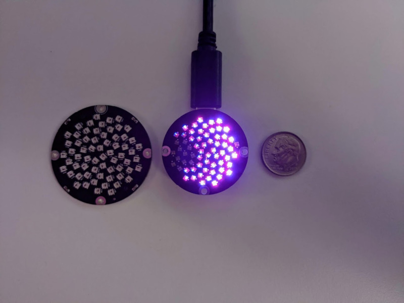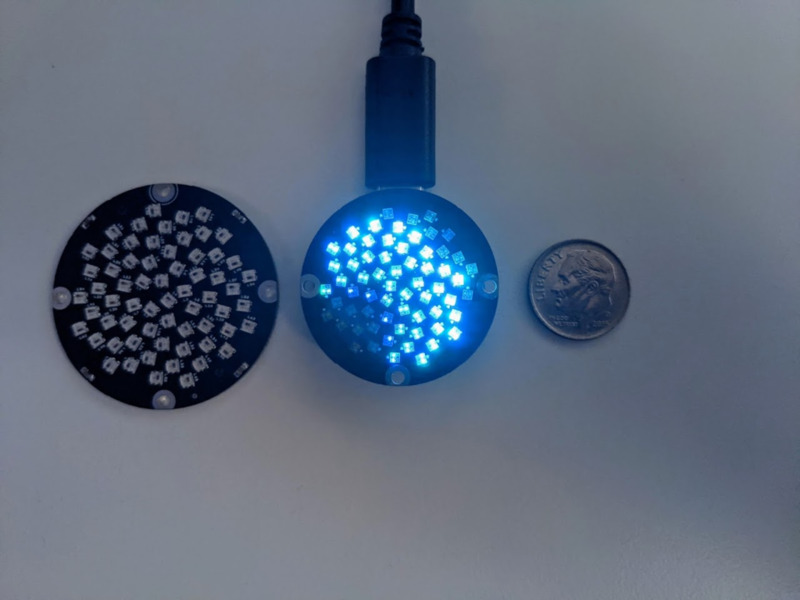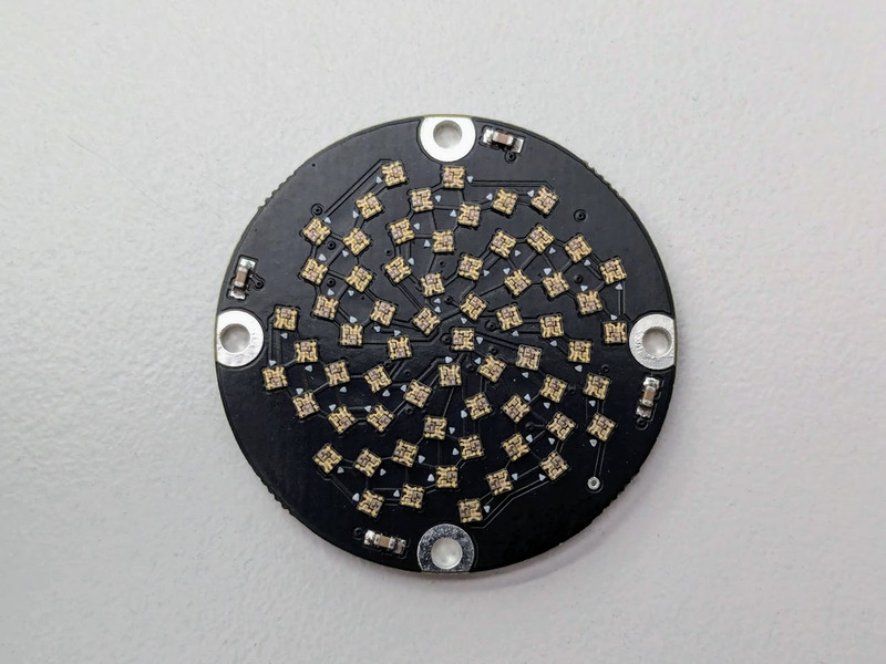 It consists of 64 SK6805-EC15 1.5mm RGB LEDs, arranged into a circular Fermat’s spiral pattern.