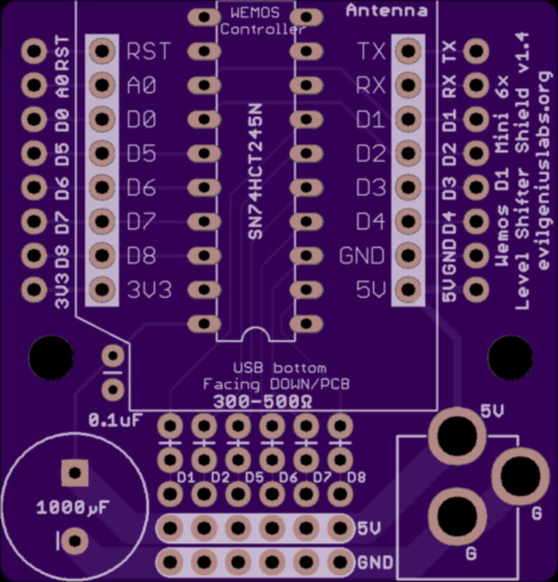 The shield includes a 74HCT245 level shifter, which is the most well-regarded high speed level shifter I’ve found. This shifts the 3.3V logic level of the ESP8266 to the 5V expected by addressable RGB LEDs. These projects often work fine without a level shifter, until they don’t.