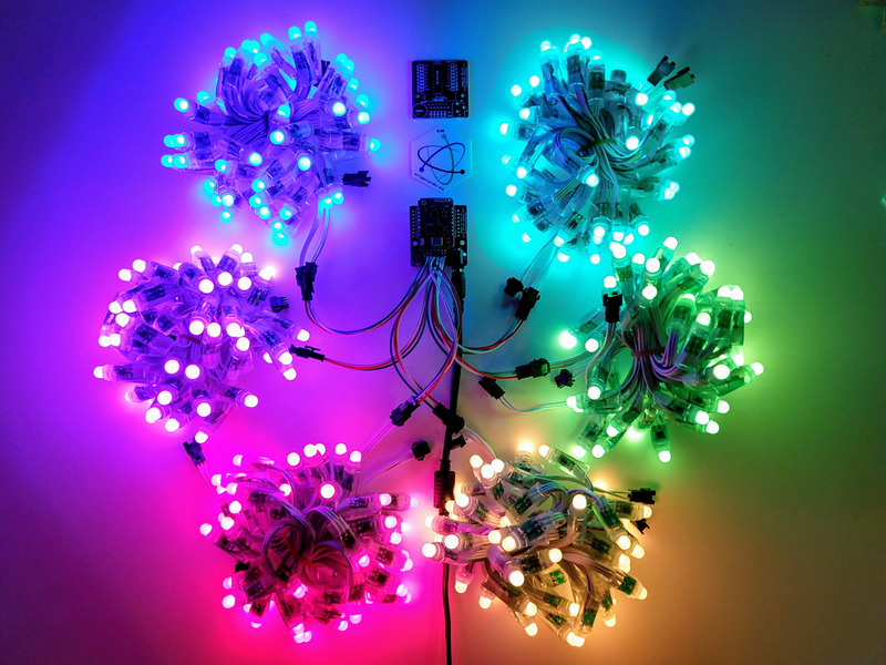 This is a shield/breakout for the Wemos D1 Mini (and D1 Mini Pro) ESP8266 board that makes it easy to control addressable RGB LEDs, such as WS2811, WS2812 (Adafruit NeoPixels), and APA102 (Adafruit DotStars). The Wemos D1 Mini is an excellent mini Wi-Fi development board, based on the ESP8266. I’ve used it extensively in development of addressable RGB LED art projects, such as my 6.5ft Rainbow Tree, Bloom v2, and Ducenti. This shield supports 6x parallel output.