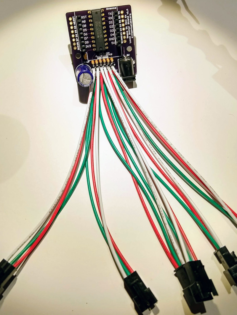 Six digital output pins (D1, D2, D5, D6, D7, D8) are run through the level shifter. These pins support parallel output by the fantastic FastLED library.
