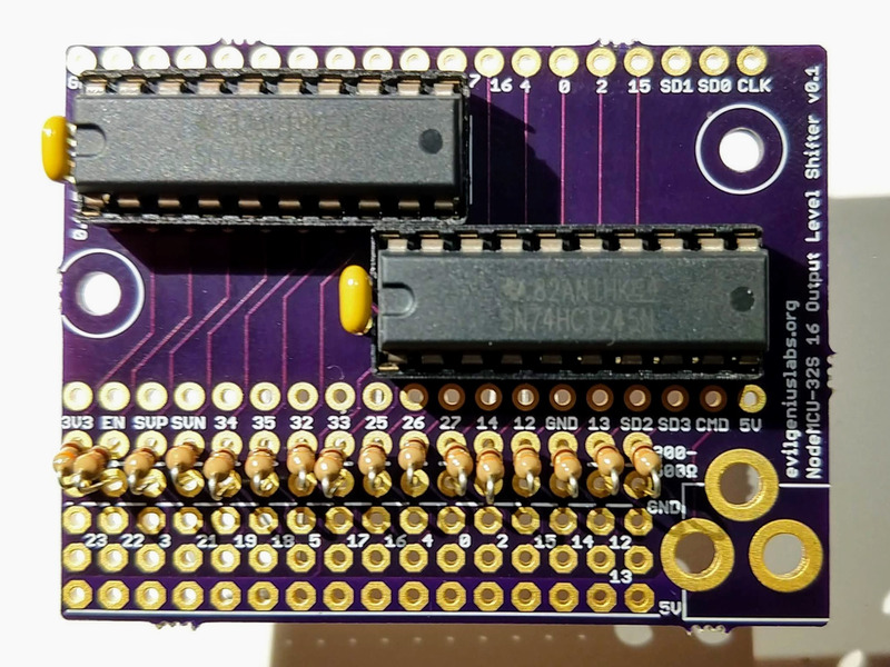 Sixteen digital output pins (0, 2, 3, 4, 5, 12, 13, 14, 15, 16, 17, 18, 19, 21, 22, 23) are run through the level shifter.