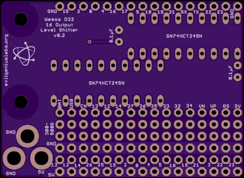 Sixteen digital output pins (0, 2, 3, 4, 5, 12, 13, 14, 15, 16, 17, 18, 19, 21, 22, 23) are run through the level shifter.