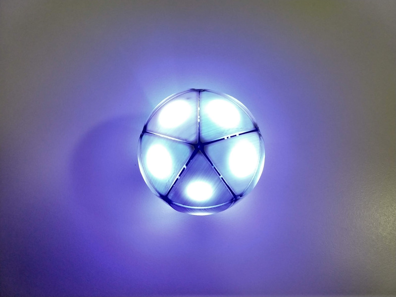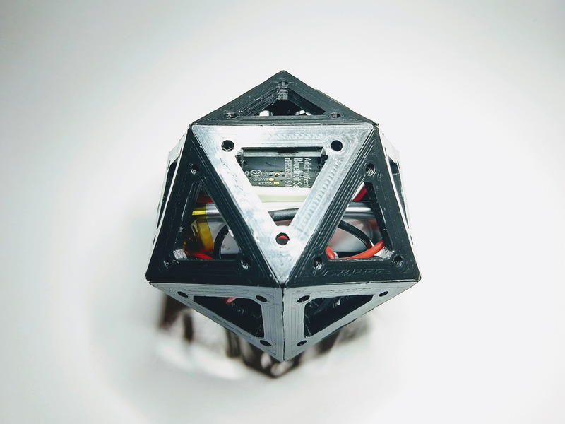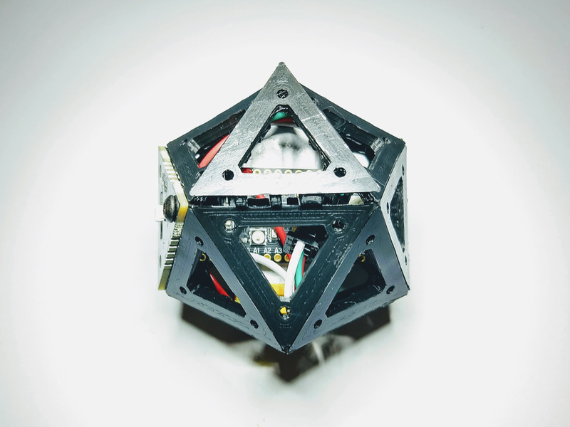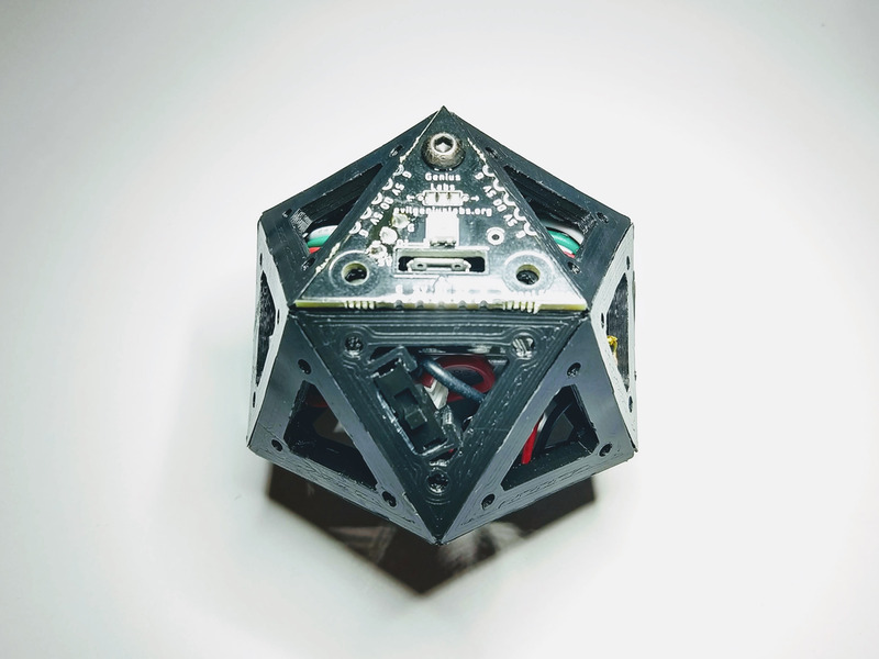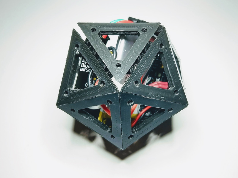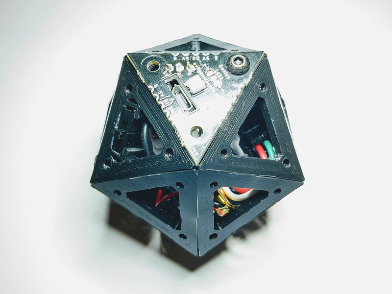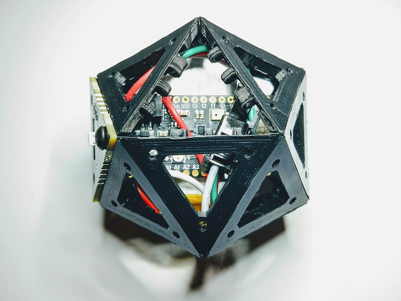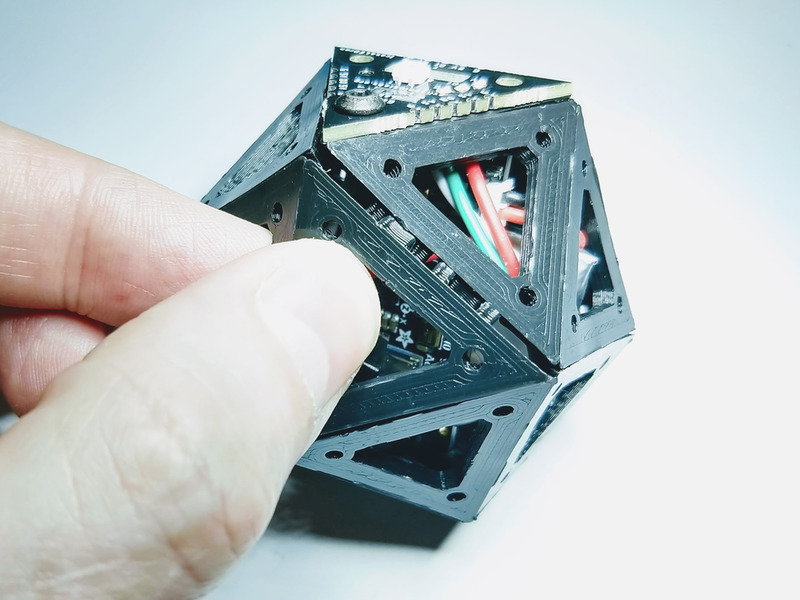 IcosaLEDron is a 20-sided polyhedron with one WS2812B-Mini-3535 addressable RGB LED per face. Each face is an equilateral triangle printed circuit board. Each edge has five castellated edge holes in a symmetrical arrangement that allows connection at nearly any angle.