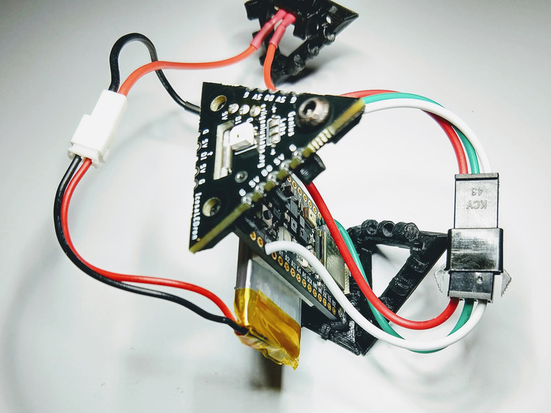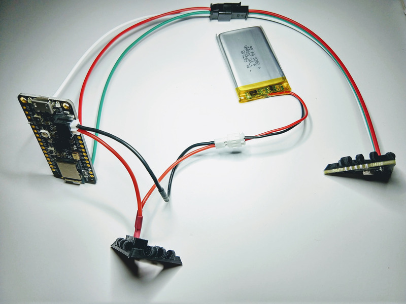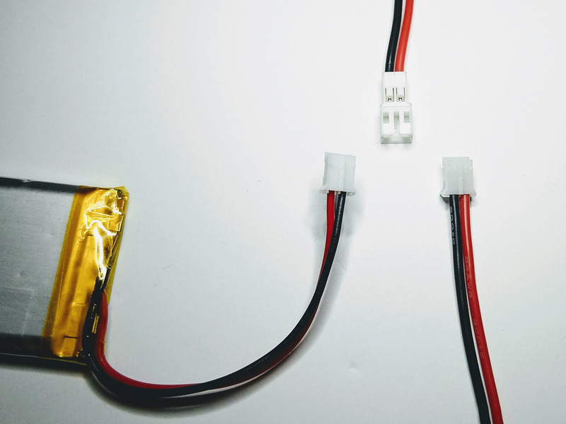 Check the polarity of your LiPo battery and JST extensions before assembling anything! There is unfortunately no standard for polarity on these, apparently. My LiPo battery and JST extensions were wired backwards compared to the Feather board. Thankfully all Feathers, and likely all Adafruit products, do use the same polarity. When looking into the LiPo connector socket on the Feather board, the left pin is positive, the right pin is negative. If the connectors do not match, use a small flat screwdriver or knife to carefully pry the plastic tabs that hold the contact inside the connectors, then gently pull the wires out. Be extremely careful not to touch the exposed battery leads! Push them back in to the correct side.