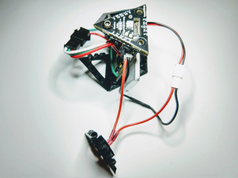 Align the triangle PCB to the face. The USB connector should be aligned inside the slot in the triangle PCB. Feed the wires inside.