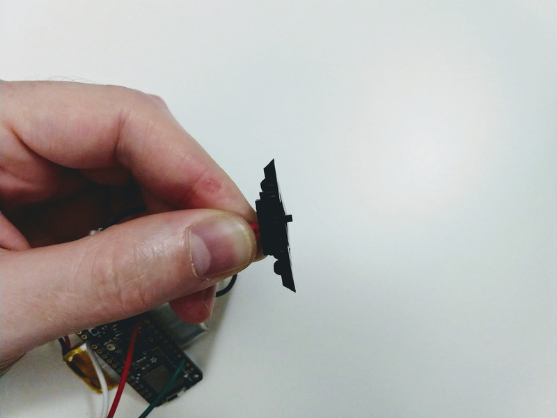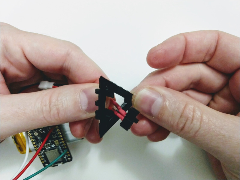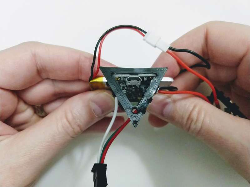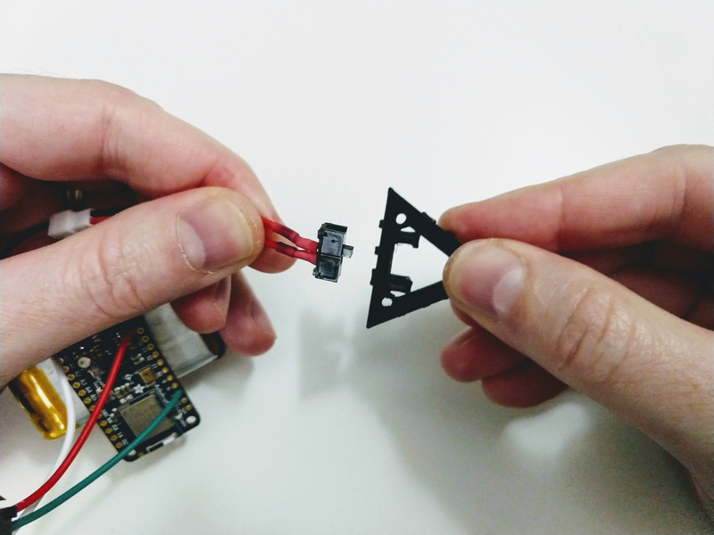 Feed the BAT, GND, and Data wires through the 3D printed triangle with the slot for the Feather’s USB port edge.