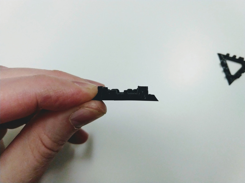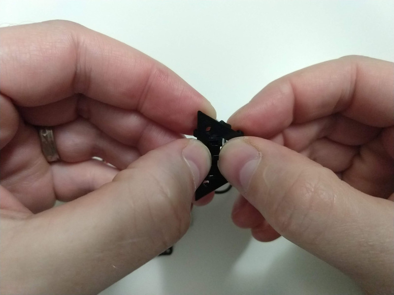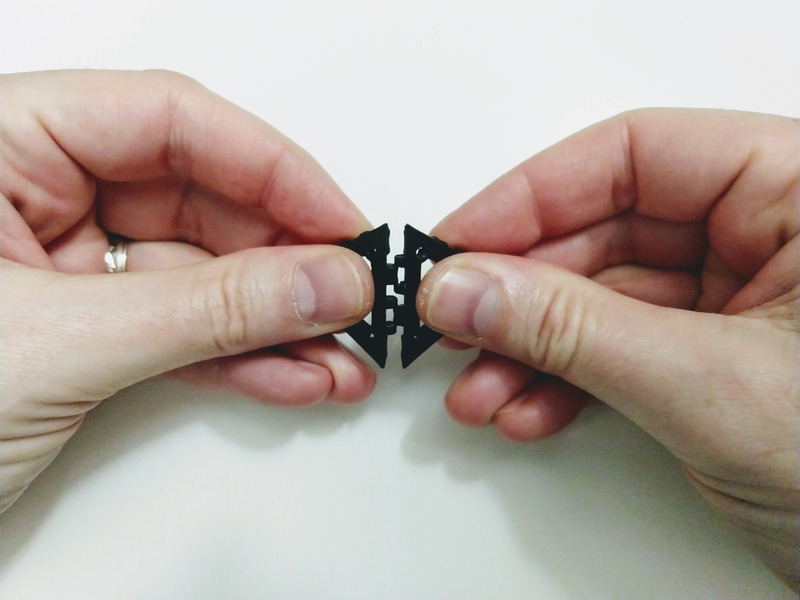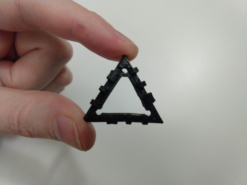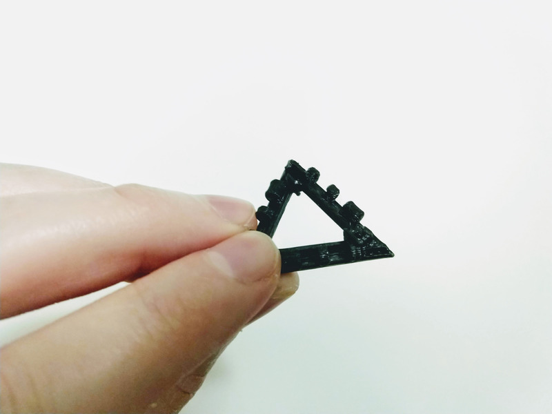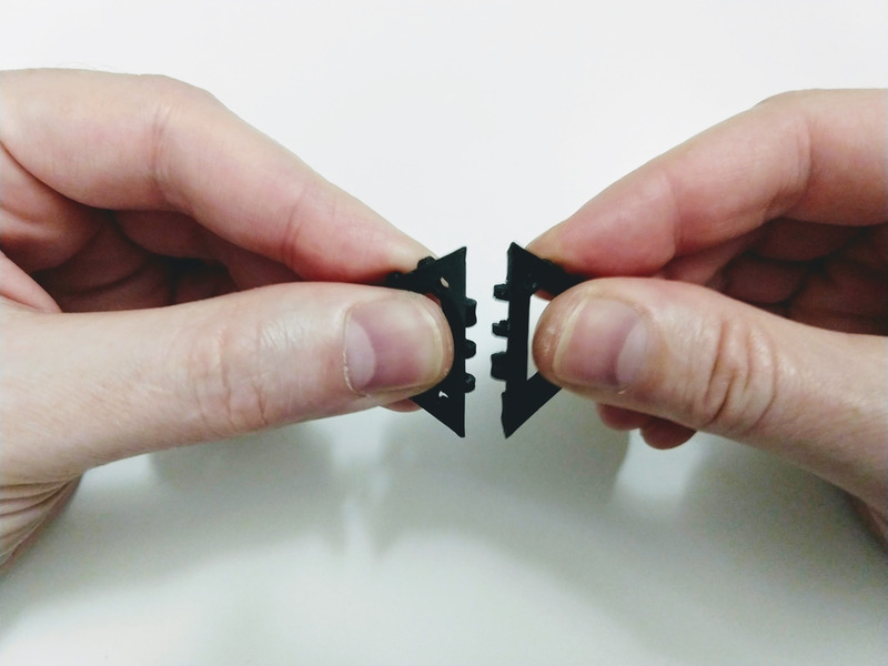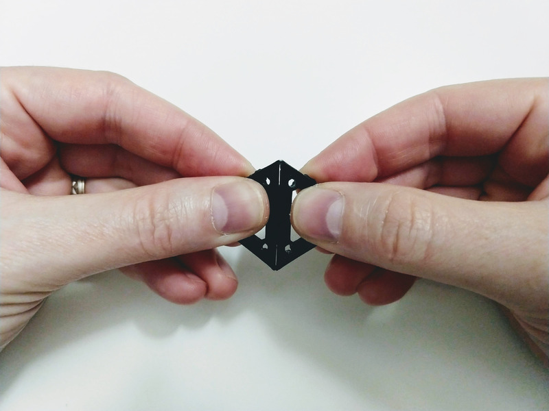 Hold two of the 3D printed triangular frame pieces securely, one in each hand. Align the hinges, then snap them together py pressing them together firmly.