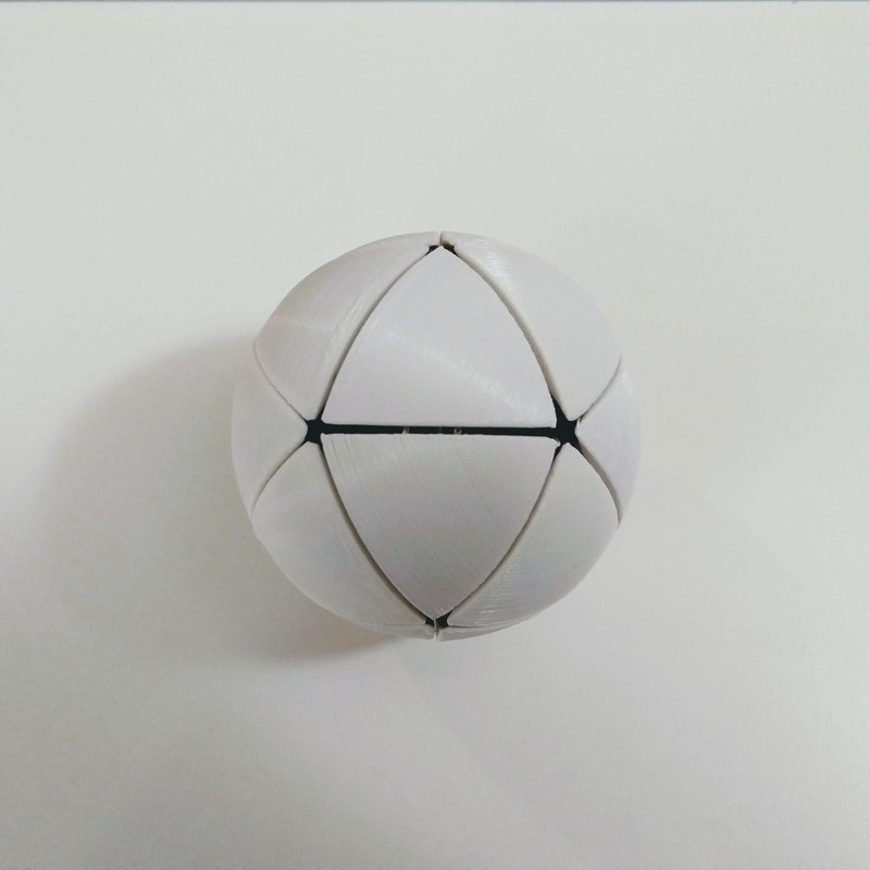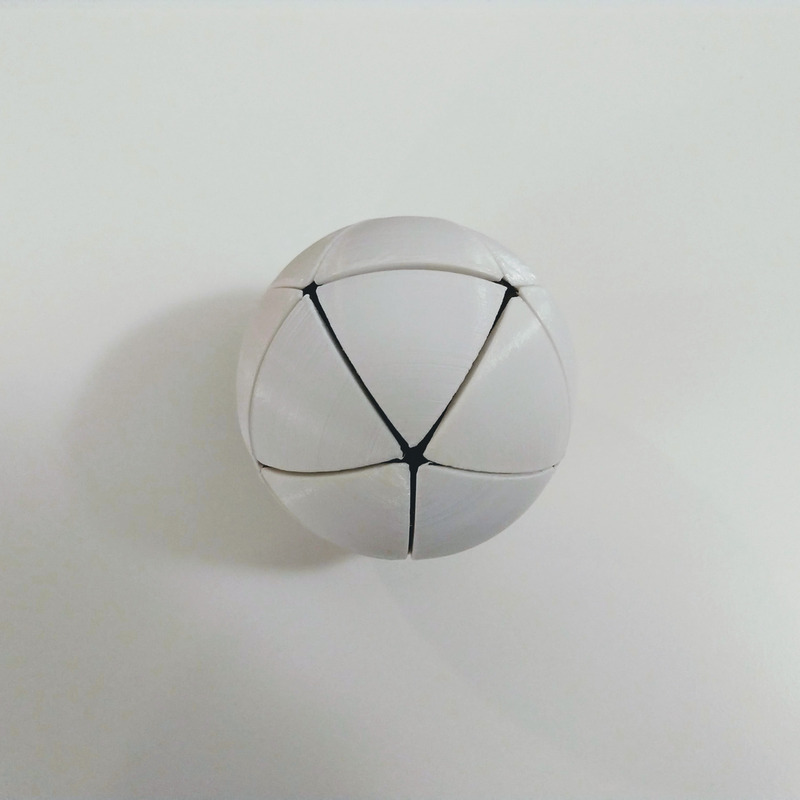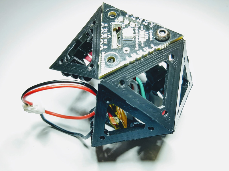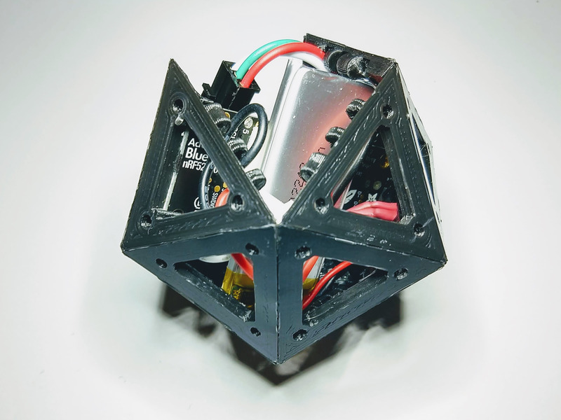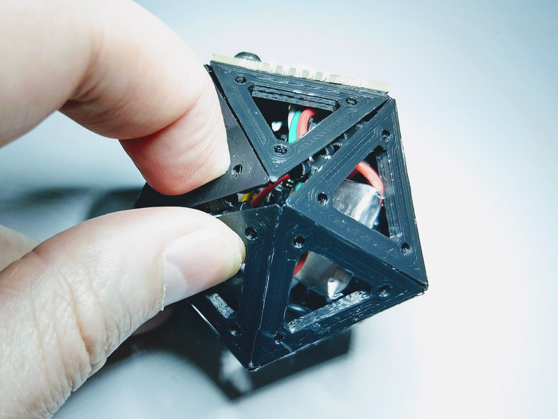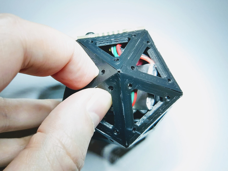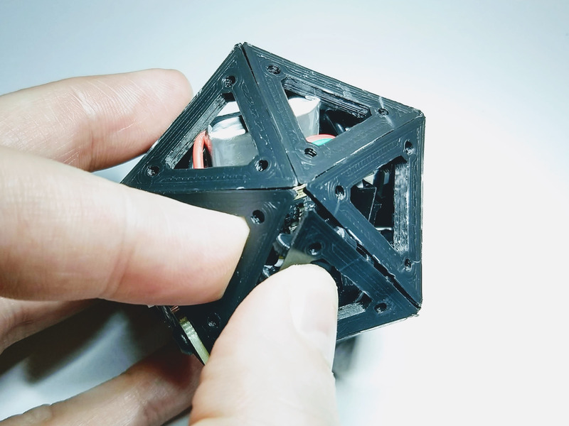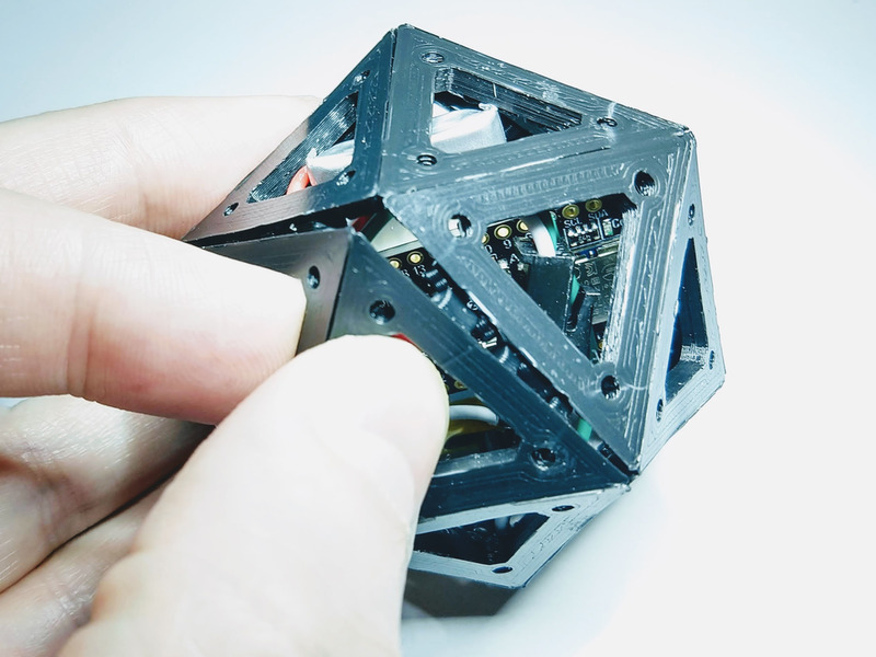 The two Feather holder pieces go on opposite faces of the icosahedron. The USB port of the Feather should be flush with the face. The other end of the Feather goes in the slots of the opposite face. One side of every triangle has a notch in the hinges, snap this edge on the same side as the Feather holder slots. Be very careful with the fragile antenna on the Feather Sense.
