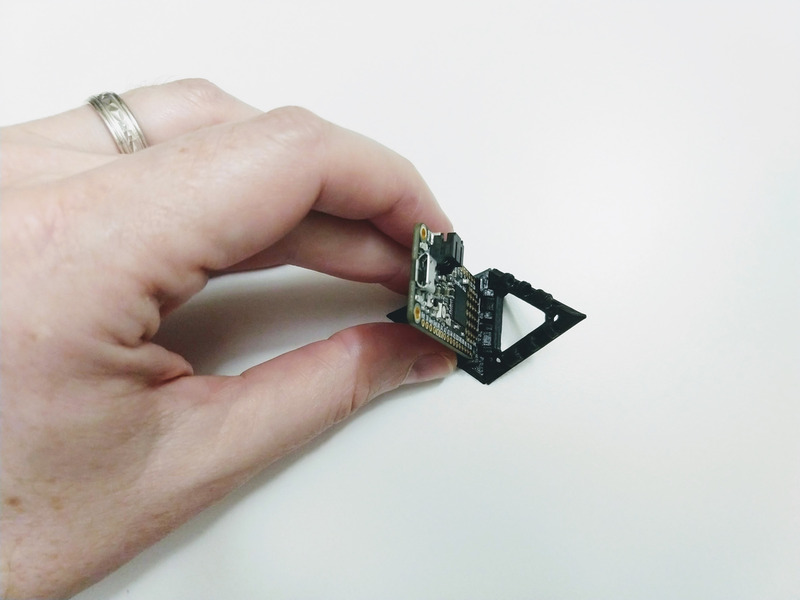Insert an M3 screw in the hole above the LED, and carefully hand-tighten it with a hex driver. Do not over-tighten. Ensure the edges of the PCB are aligned with the edges of the triangle frame piece.