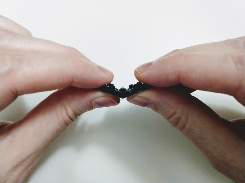When you get to the last piece, with an adjacent piece on each of the three sides, follow the same steps. Set it in the gap, with the hinges aligned, then using your thumb and pointer finger, snap them together, one side at a time.