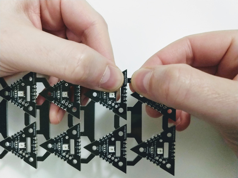 Carefully snap the triangle PCBs apart. Hold securely and very closely on both sides of a single perforation and bend to flex and snap the perforation. Do not flex the entire panel at once. Sandpaper can be used to clean up any rough edges, but do this in a well ventilated area with a mask on to prevent breathing in the dust.