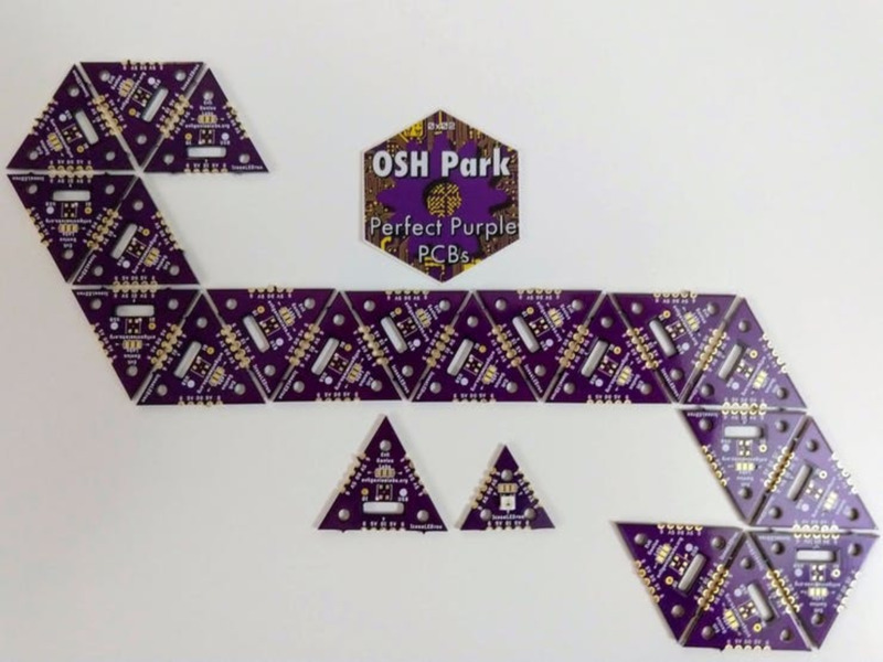 The triangle PCBs each have a small jumper pad used to direct the output direction of the serial LED data signal. We’re going to connect the PCBs in the order and arrangement shown in the picture above.