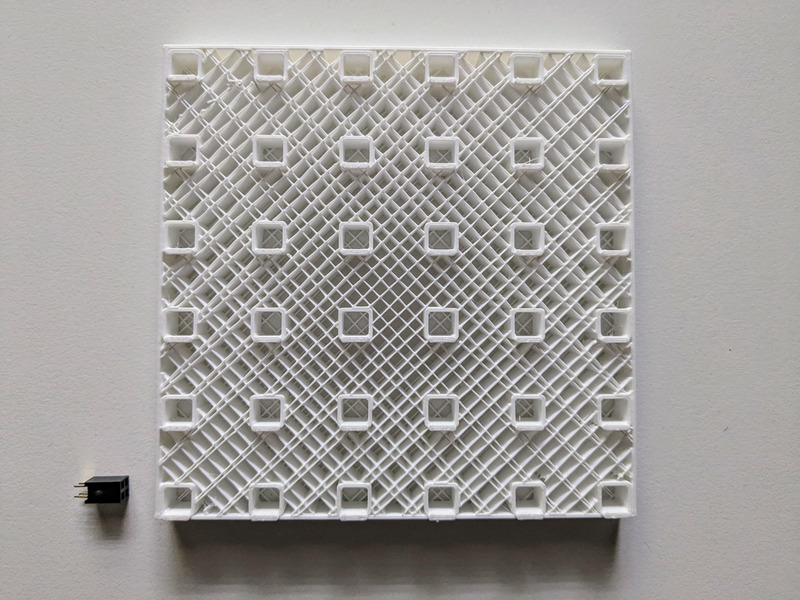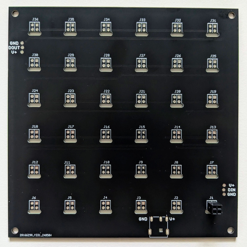 It consists of 216 5mm WS2812 addressable RGB LEDs, divided into 36 vertical sticks, each with 6 LEDs. Each stick has a 2x2 right-angle pin header (5V, GND, Data In, and Data Out). The data is routed from the Data In pin to the first (bottom) LED, which has its Data Out pin connected to the Data In pin of the next LED, etc. The last (top) LED on the stick then has its Data Out pin routed back down the stick to the Data Out pin on the header.
