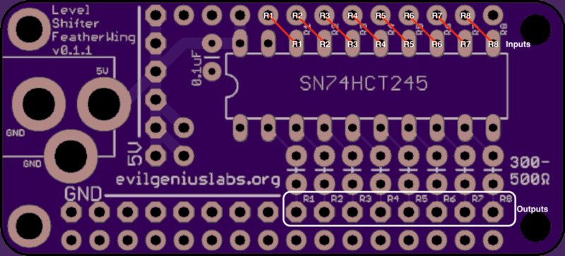 The shield includes a 74HCT245 level shifter, which is the most well-regarded high speed level shifter I’ve found. This shifts the 3.3V logic level of the ESP32 to the 5V expected by addressable RGB LEDs. These projects often work fine without a level shifter, until they don’t.