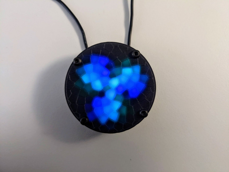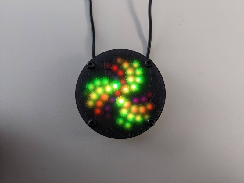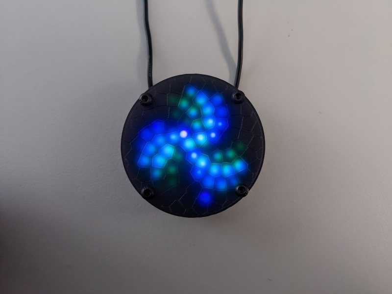 Lux Lavalier is a beautiful wearable 40mm battery powered pendant necklace with 64 SK9822-2020 “HDR” RGB LEDs surface mounted in a Fibonacci distribution and a Pixelblaze V3 Pico controller built in.