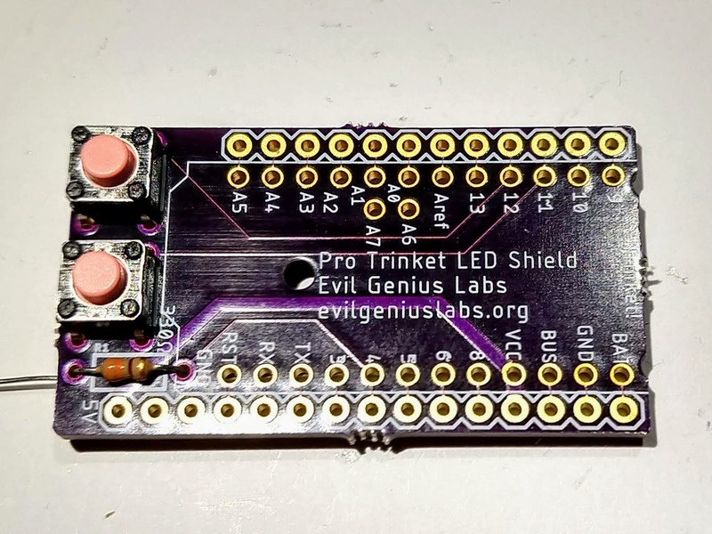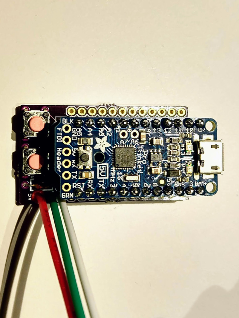 One digital output pin (D4) is run through a data line resistor, as recommended by Adafruit’s NeoPixel Best Practices.