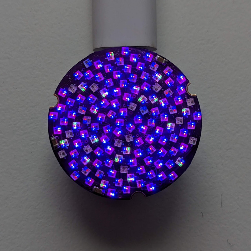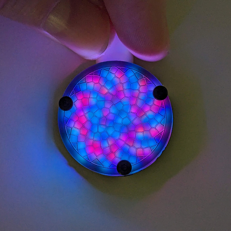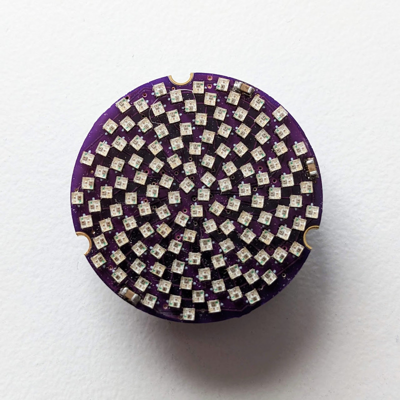 It consists of 128 XL-1010RGBC-WS2812B 1mm² RGB LEDs, arranged into a circular Fermat’s spiral pattern.