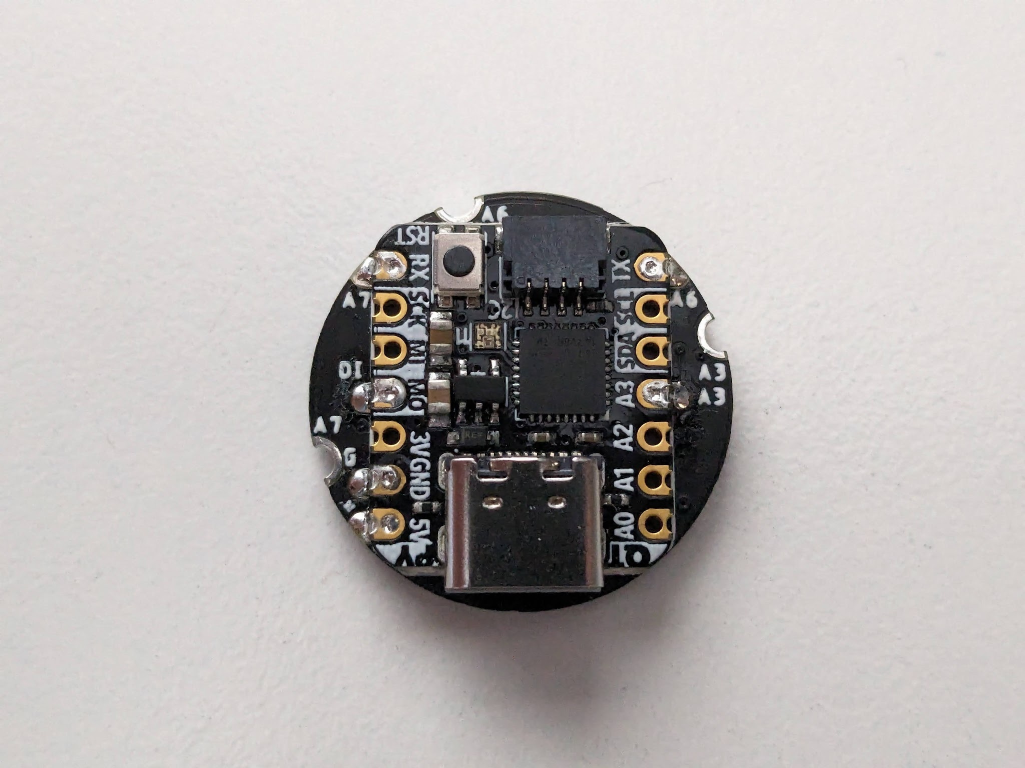 It has solder pads on the back that match the pinout of the QT Py by Adafruit, or XIAO by Seeed. It can be used by any microcontroller via the 5V, GND, and Data In pins. It also has a Data Out pad, for connecting more LEDs on the same data pin.