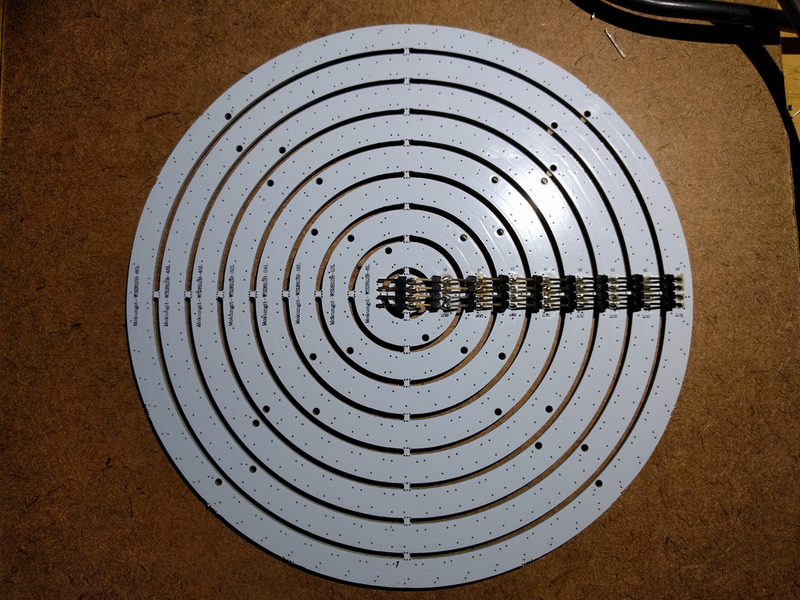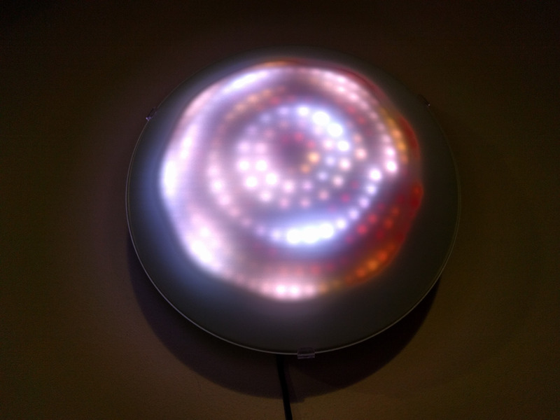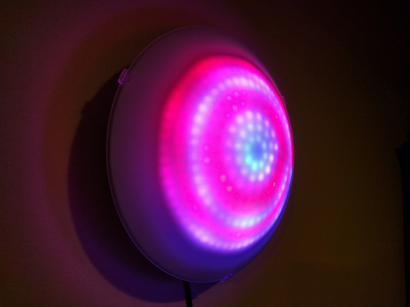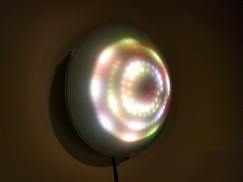 Dome-shaped, wall-hung frosted glass and metal, with an inner 3D printed frame for 240 RGB LEDs. Driven by an ESP8266 microcontroller using the FastLED library, controlled with a web app over WiFi and/or an infrared remote control.