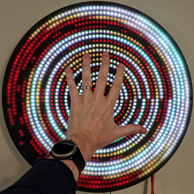 Sol v2: 420mm (16.5”) wide, 1,600+ RGB LEDs wall-mounted behind laser cut translucent black acrylic. Mapped in XY & polar coordinates, driven by an ESP8266 using the FastLED library.
