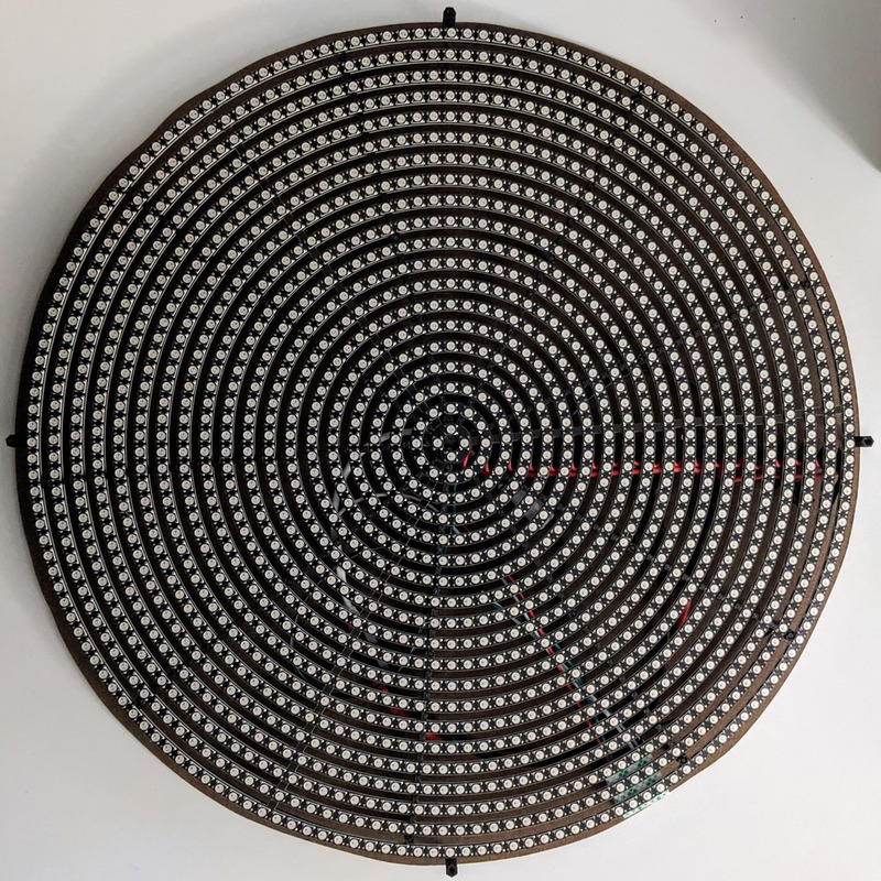 Mounted on 3mm wood back plate, 3D printed inner frame to keep the LED rings evenly spaced, with M3 standoffs between the back plate and frame, and between the frame and front acrylic.